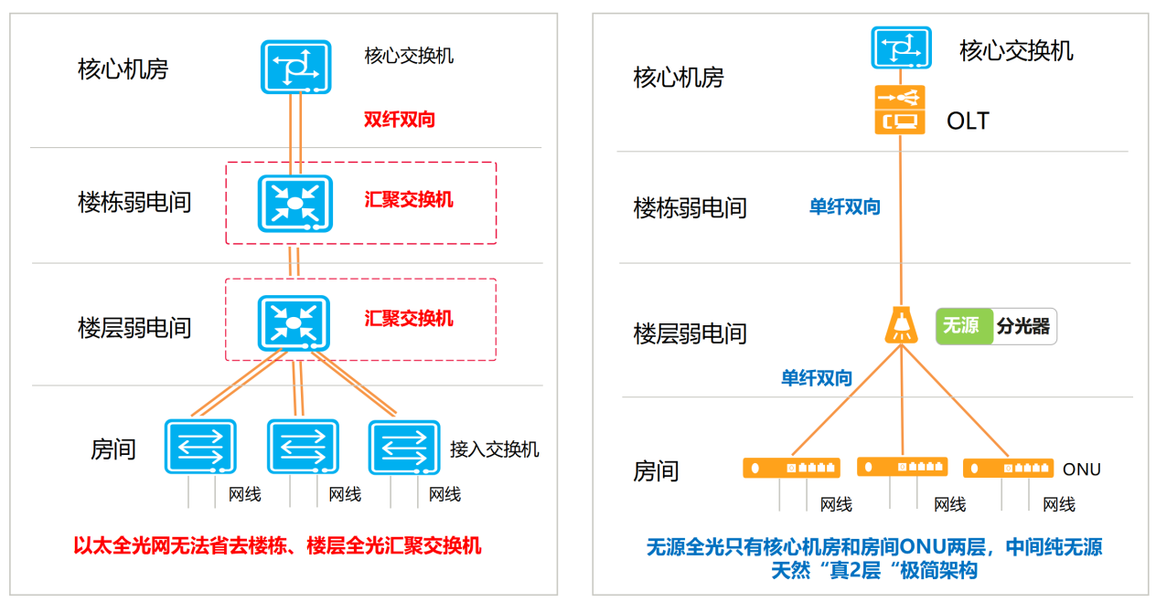 1. **组网差异化**  | 维度 | 传统方案 | 智慧光迅全光方案 | | --- | --- | --- | | 网络系统 | 办公网、客用网、设备网三套系统,P2P架构,每套系统单独走线需要核心和大量接入交换机、POE交换机,节电设备多 | 二层架构无源分光,使用分光器取代所有汇聚和接入交换机,点到多点结构简单维护方便 | | IPTV系统 | 电视机单独一套系统 | 客房光AP含网口,无需单独布线 | | 电话系统 | 程控交换机模式,需要用到大对数线缆及110配线架,不方便管理 | 客房光AP含电话口,无需单独布放电话线 | **2、功能差异化** | 功能维度 | 传统网络方案 | 智慧光迅全光网络方案 | 对酒店的影响 | | --- | --- | --- | --- | | **1\. 网络架构与布线** | **烟囱式组网**:• 需多台节点交换机。• 弱电间需供电、散热、占空间。• 线缆种类多(光纤、网线)。 | **极简扁平,一纤多能**:• 只有终端和机房设备两级。• **弱电间设备少**,节省空间并消除噪音和热源,降低安全隐患。• 一根光纤承载所有业务(上网、电话、电视、智能控制)。 | **【全光优势】**:•**节省空间与能源**:降低电费。•**简化工程**:布线更简单,线缆更轻、更细,桥架压力小。 | | **2\. 智能化业务融合** | **多网并存,整合复杂**:• 电话网、电视网、客控网、客用网独立布线,系统之间关联度不高。• 增加新智能设备需重新布线,需考虑核心设备扩容。 | **一网承载,天然融合**:• 所有业务(语音、视频、数据、智能控制)通过同一张光纤网络承载,同时可实现系统联动。 | **【全光优势】**:• **降低集成复杂度**:为统一的酒店智能化管理平台提供了理想的底层网络基础。• **扩展性极强**:添加新业务如同“软件配置”,无需改动物理线路。 | | **3\. 绿色节能与成本** | **能耗较高**:• 大量楼层交换机7x24小时运行,能耗显著。 | **绿色低碳**:• 取消了楼层有源设备,整体能耗**降低30%以上**。 | **【全光优势】**:• 长期运营节省大量电费,符合绿色酒店理念。 | | **4\. 安全与可靠性** | **风险点分散**:• 每个楼层弱电间都是一个潜在的物理安全风险和故障点。• 电缆易受电磁干扰。 | **安全性集中,抗干扰强**:• 有源设备集中于核心机房,物理安全可控。• 光纤本身**免疫电磁干扰**,信号传输更稳定可靠。 | **【全光优势】**:• **提升整体可靠性**:网络中间环节“零”故障。 | **3、设备及线材成本差异化(济南同派270间房为例)** | **智慧光迅全光网络设备及线材清单** | | | | | | | | | | | --- | --- | --- | --- | --- | --- | --- | --- | --- | --- | | 名称 | | 单位 | | 数量 | | 单价 | | 总价 | | | 万兆核心路由 | | 台 | | 1 | | 6,650\.00 | | 6,650\.00 | | | AC 控制器 | | 台 | | 1 | | 7,500\.00 | | 7,500\.00 | | | 万兆核心交换机 | | 台 | | 1 | | 26,500\.00 | | 26,500\.00 | | | OLT服务器 | | 台 | | 1 | | 40,000\.00 | | 40,000\.00 | | | 电话服务器 | | 台 | | 1 | | 20,800\.00 | | 20,800\.00 | | | IPTV 流媒体网关 | | 台 | | 1 | | 7,500\.00 | | 7,500\.00 | | | 24口POE MDU | | 台 | | 23 | | 1,800\.00 | | 41,400\.00 | | | 8口PO EMDU | | 台 | | 16 | | 630\.00 | | 10,080\.00 | | | WI\-FI6双频光AP\+ | | 台 | | 296 | | 320\.00 | | 94,720\.00 | | | WI\-FI6双频吸顶 | | 台 | | 80 | | 385\.00 | | 30,800\.00 | | | 网线 | | 米 | | 7880 | | 2\.00 | | 15,760\.00 | | | 皮线光纤 | | 米 | | 23680 | | 0\.20 | | 4,736\.00 | | | 合计 | | 306446\.00 | | | | | | | | | 单房造价 | | 254966 | | | | | 861 | | | | 监控单点造价 | | 51480(350点位) | | | | | 147 | | | | 工时 | | 170 | | | | | | | | | **传统网络设备及线材清单** | | | | | | | | | | | 名称 | 单位 | | 数量 | | 单价 | | | | 总价 | | 万兆核心路由 | 台 | | 1 | | 6,650\.00 | | | | 6,650\.00 | | AC 控制器 | 台 | | 1 | | 7,500\.00 | | | | 7,500\.00 | | 万兆核心交换机 | 台 | | 1 | | 26,500\.00 | | | | 26,500\.00 | | 程控交换机 | 台 | | 1 | | 25,000\.00 | | | | 25,000\.00 | | IPTV 流媒体网关 | 台 | | 1 | | 7,500\.00 | | | | 7,500\.00 | | 24口POE交换机 | 台 | | 48 | | 1,500\.00 | | | | 72,000\.00 | | 24口接入交换机 | 台 | | 40 | | 1,100\.00 | | | | 44,000\.00 | | 面案AP | 台 | | 270 | | 280\.00 | | | | 75,600\.00 | | 吸顶AP | 台 | | 80 | | 400\.00 | | | | 32,000\.00 | | 网线 | | 米 | 62100 | | 1\.80 | | | | 111,780\.00 | | 合计 | | 408530\.00 | | | | | | | | | 单房造价 | | 357050 | | | | | 1206 | | | | 监控单点造价 | | 51480(350点位) | | | | | 147 | | | | 工时 | | 270 | | | | | | | | **4、价值差异化** | 价值维度 | 传统网络方案 | 智慧光迅全光网络方案 | | --- | --- | --- | | **1\. 商业与投资价值** | • 多次设备投资(楼层弱电间)。• 升级需重复布线、更换设备。 | **全生命周期TCO(总拥有成本)更低**:• **一次布线,长期使用**,光纤生命周期超过30年。• **平滑升级**,仅更换两端设备,保护初始投资。• **节省空间与能源** | | **2\. 运营与效率价值** | 专职IT一名 | **与水电工共用兼职** | | **3\. 客户体验与品牌价值** | **提供“标准化”网络服务**:• 尽力而为的带宽,高峰时段可能拥堵。• 体验同质化,无法形成品牌记忆点。 | **电视、电话、网络、客控、机器人等不再是复杂堆叠的智能化,打造极简融合的“真”智能化系统,** | | **4\. 安全与稳定性价值** | **风险分散,隐患较多**:• 多个弱电间存在物理安全风险。• 铜缆易受干扰,信号稳定性有挑战。 | **本质安全,超高可靠**:• 核心设备集中管控,物理安全等级高。• 光纤抗电磁干扰,传输稳定。 | | **5\. 绿色与可持续发展价值** | **能耗较高,**:• 大