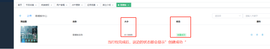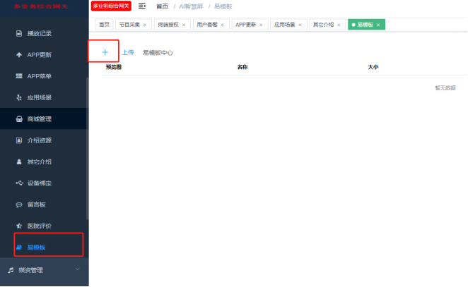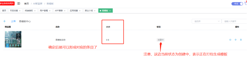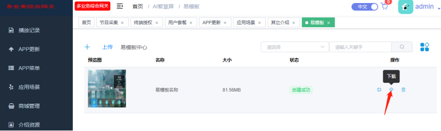 【产品功能】-基础 2025.08.21 XOS综合网关-终端模块-生成和创建易模板&易模板的下载 操作背景:在XOS的实际使用中,服务器上有很多关于桌面的配置,比如,UI的配置素材,菜单的配置素材等等,这些配置里面使用的素材和图片是不会在系统文件的配置备份中的,这会遇到以下两种场景: 场景一:针对连锁式的酒店,UI风格有统一的规范和要求,此时,咱们想单纯地将酒店A的UI备份,并应用在另一台服务器上,再做修改 场景二:设备换机,仅使用系统配置文件的备份,是没有对应素材的,那么在这种情况下,UI就需要重新配置,桌面UI的备份就显得迫在眉睫。 针对这两个场景,易模板的功能就显得迫在眉睫 本教程可以解决: (1)易模板备份的生成(生成到本机服务器) (2)易模板备份的下载 1、易模板备份的生成操作 将服务器的某个应用场景添加生成一个易模板包到服务器的“易模板库”中,操作如下:    生成后,可以在易模板包库里面查看到效果   2、易模板备份的下载 从“易模板库”中,将需要的易模板包下载到本地电脑,操作如下:  点击”下载“按钮,即可将易模板包,下载到本地