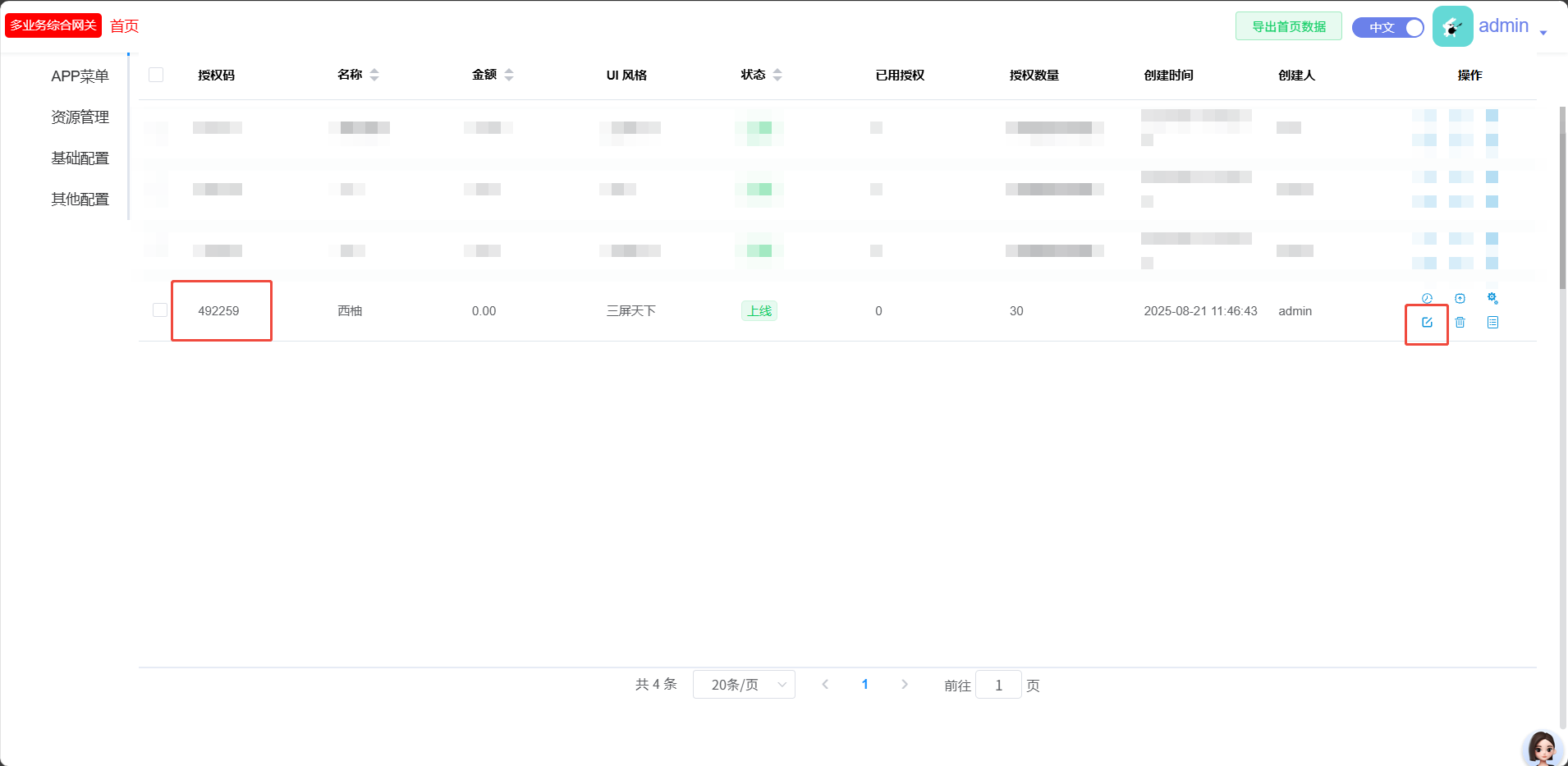 【产品教程】-基础 2025.08.21 XOS综合网关-终端模块-运营模式下的授权码认证(部署+应用) 适用场景:适用于多场景使用同一台服务器的情况下,且需要使用授权码认证的时候,该场景账号所属者拥有全量模式和运营模式的操作权限,或者由拥有全量模式操作权限的人编辑授权码认证,方可在运营模式下将授权码给电视终端进授权码认证,具体步骤如下: 1、综合网关进入全量模式,点击AI智慧屏的终端授权,点击认证模式,选择授权码认证,点击提交数据  2、拥有运营模式的用户登入登入综合网关显示运营模式的界面,双击对应的应用场景,找到对应的用户套餐,可以看到改用户套餐的授权码,终端输入改授权码即可认证上来,点击编辑可以编辑终端认证的数量   3、可以用模拟器测试一下,认证上来后可以在运营模式下看到认证上来的终端: