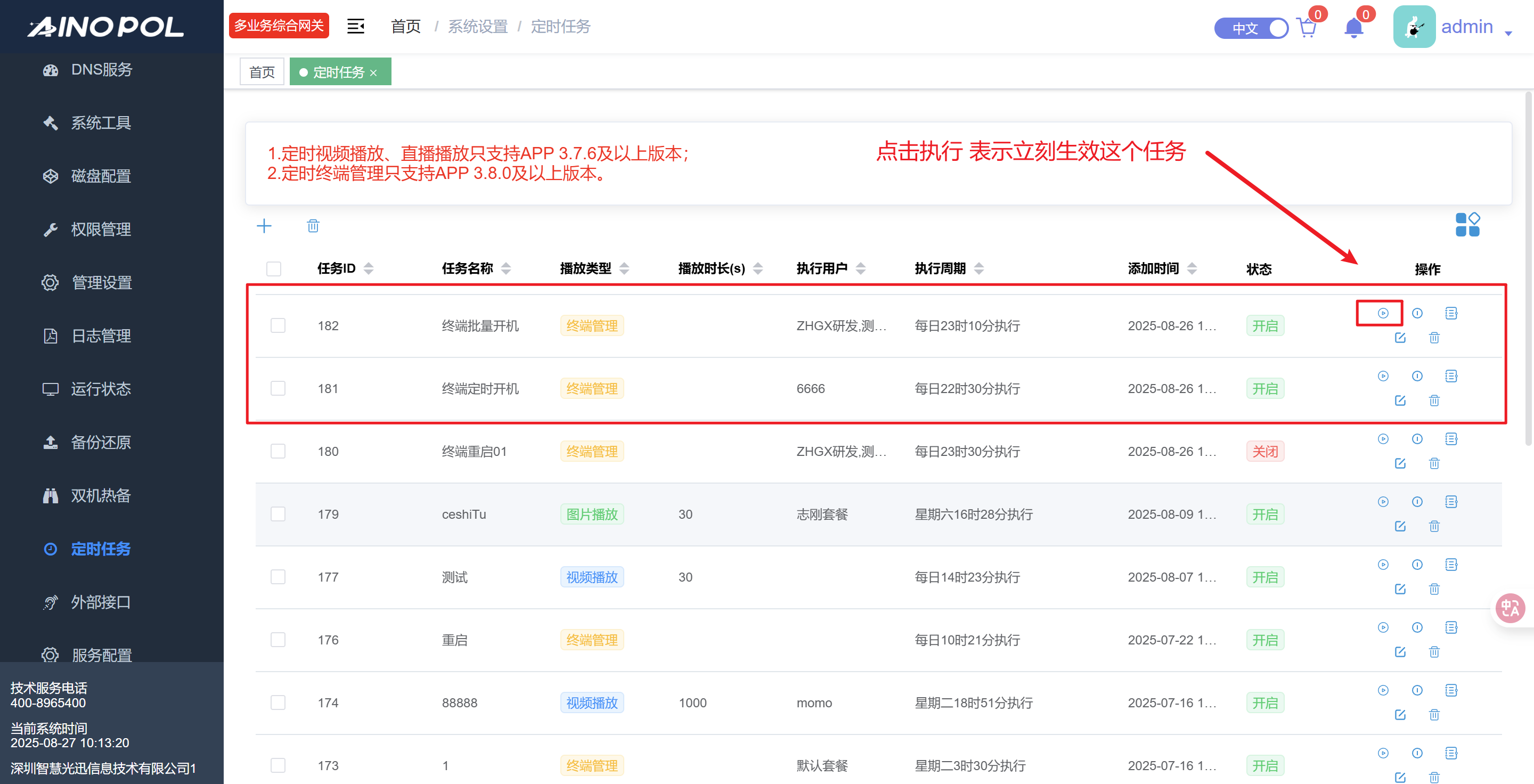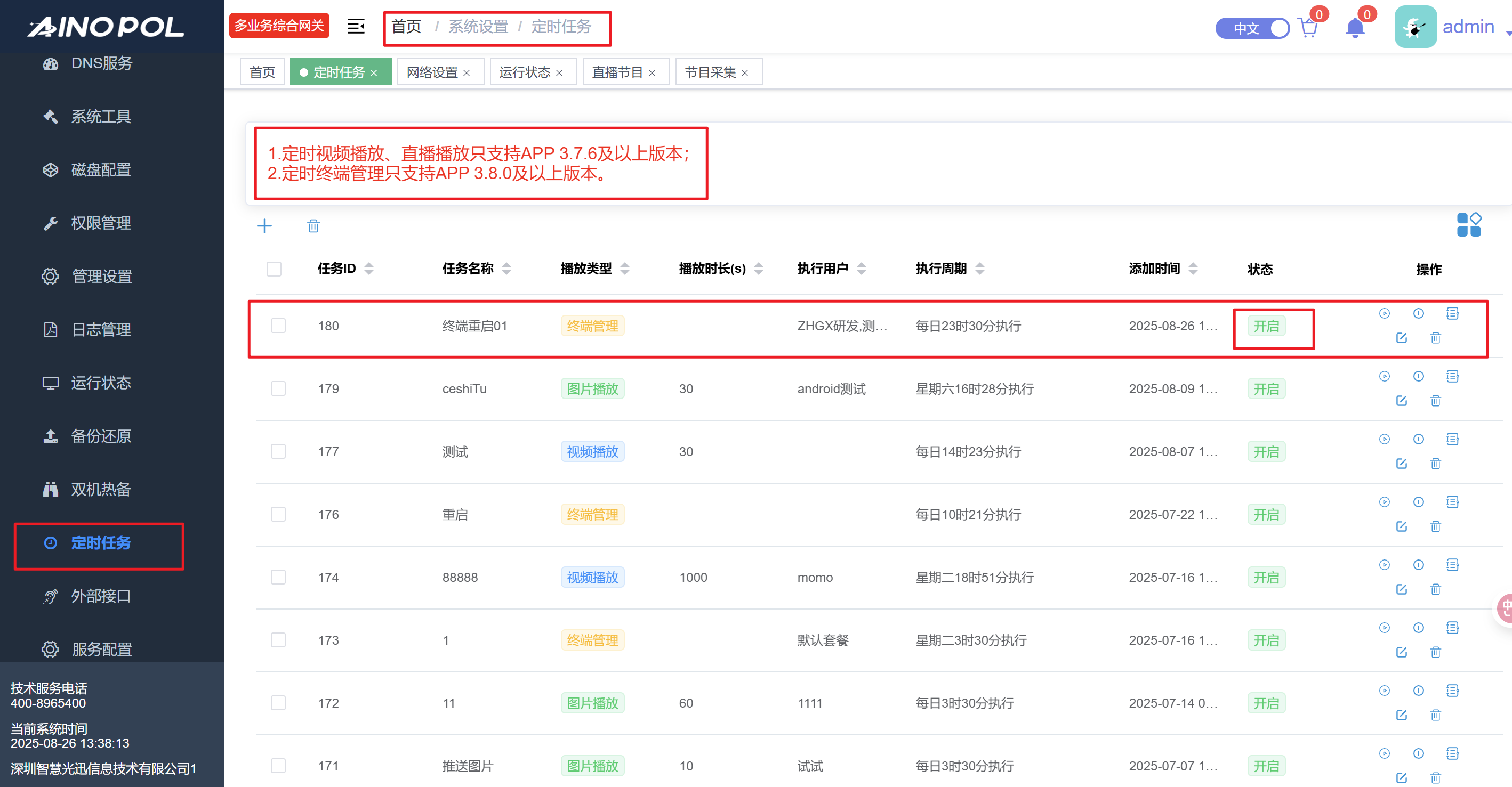 【产品功能】-基础2025.08.21XOS综合网关-终端模块-终端定时重启 操作背景:终端长期运行易因缓存堆积、用户数据残留或误操作导致卡顿、设置错乱。定时重启可自动清除用户记录,提高设备运行性能。 1、做与时间有关操作时,需要注意设备时间是否正确,以综合网关系统时间为准,在网络设置,时区设置中查看(左下角的时间是电脑时间,并非综合网关系统时间)  2、在系统设置的定时任务中,创建定时任务,选择终端管理,做重启操作(这里的重启是指电视终端的重启)  3、状态显示开启,就表明开启这个定时任务  4、点击执行表示立即生效该任务