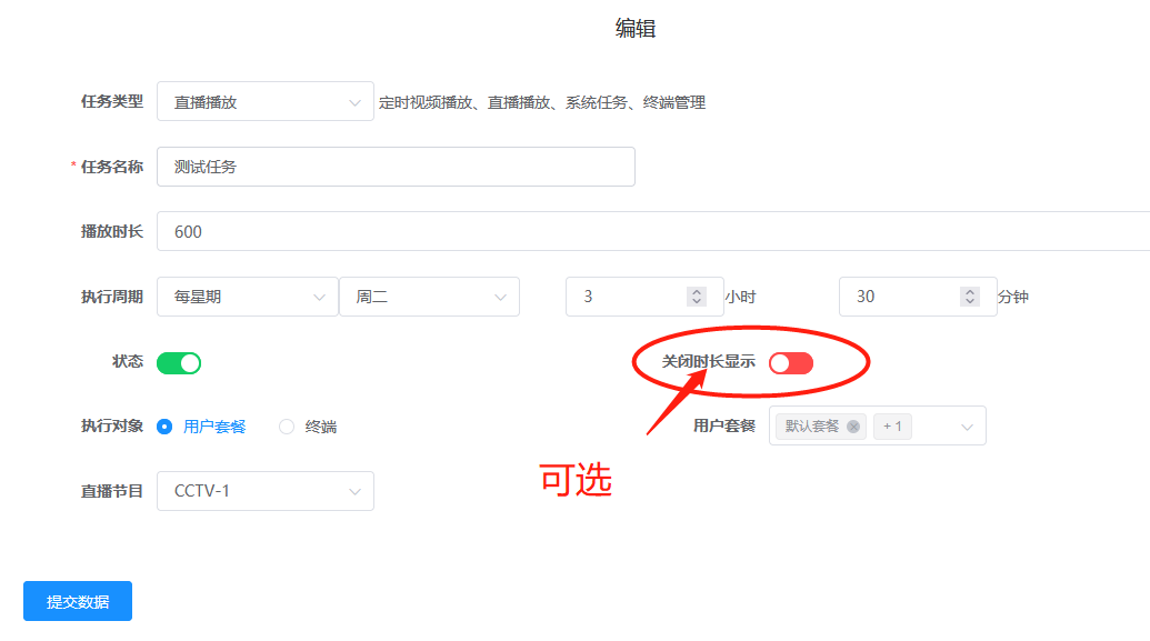 【产品功能】-基础 2025.08.21 XOS综合网关-媒资模块-定时播放指定节目 环境需求: 后台版本:C01V06R003P221110 APK版本:6.0.16或 ZHGXTV-C01V06R018P221028 1.定时视频播放、直播播放只支持APP 3.7.6及以上版本; 2.定时终端管理只支持APP 3.8.0及以上版本。 在系统设置--定时任务模块里进行配置。 定时插播分“一次性插播”/“周期性插播” 1:介绍“一次性插播” ,从 X点 到 Y点 ,一直执行此任务 ( 要以 “当前之后”的时间开始 ) ,一次性插播是没有时长显示的   2:创建成后可点击立即执行进行测试。( 一次性插播是没有时长显示的 )  查看日志执行成功,终端自动播放。 1:周期性插播,定时任务( 设置从什么时间开始,然后执行 X 秒的任务方式 ) 周期性插播支持视频/直播插播, 但是  2:定时插播,CCTV-1台 插播600秒