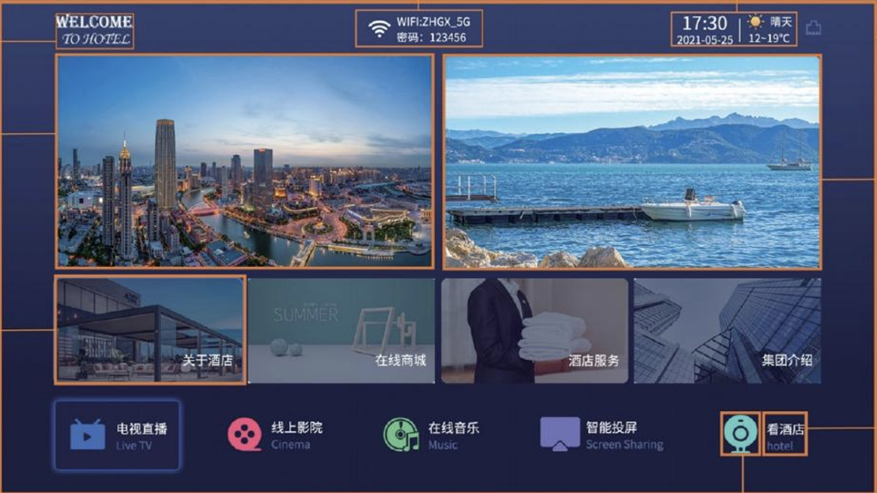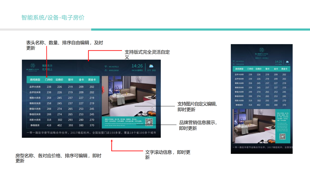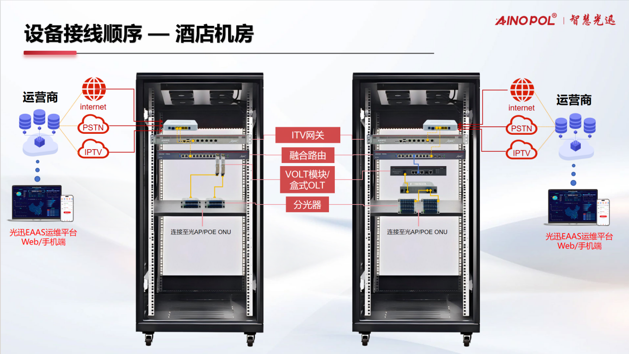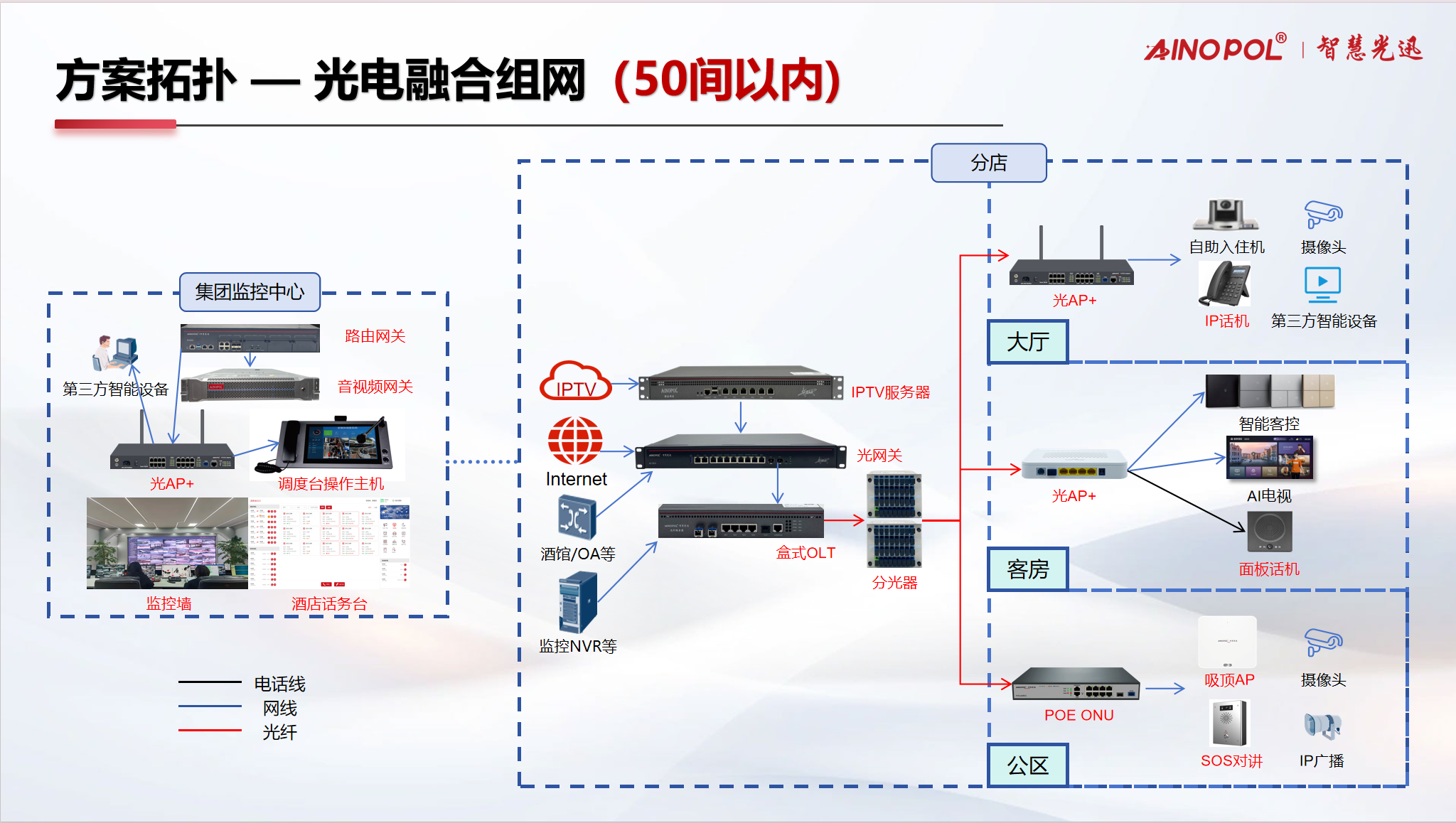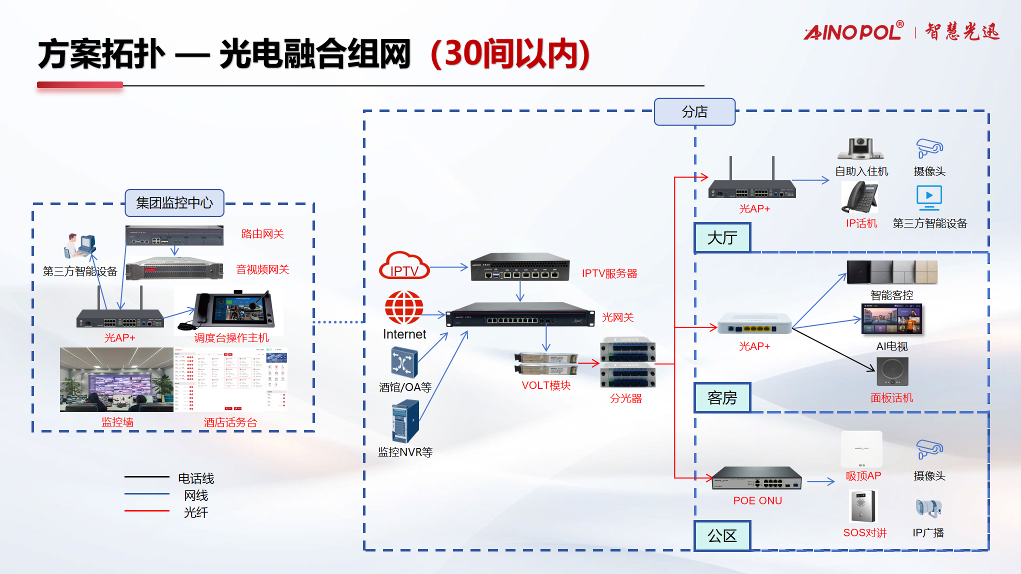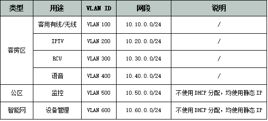 <center> **XX无人酒店管理集团IT标准** **2025v1\.0** **XX酒店管理集团IT信息部** </center> 目录 IT设备配备标准 4 第一章 业务设备标准 5 1\.1 办公电脑硬件设备 5 第二章 外网带宽接入标准 7 2\.1 外网宽带接入标准 7 2\.2 客用网络标准 7 第三章 弱电网络建设标准 15 3\.1 OLT光接入 15 3\.2 分光器 16 3\.3 光电AP\+ 16 3\.4 POE ONU/MDU 16 POE ONU/MDU 16 3\.5 电话终端 17 3\.7监控设备标准 19 第四章 机房建设及施工标准 27 4\.1 酒店机房建设标准 27 4\.2 监控机房建设标准 28 4\.3 综合布线施工标准 29 4\.4 机房线材选用标准 30 4\.5 网络标签要求 30 第五章 增值类设备系统 32 5\.1 智能系统/设备–IPTV系统 32 5\.2 信息发布系统 41 5\.2\.2 信息发布系统硬件与软件 42 第六章 智能客控方案 43 6\.1 智能客控方案 43 第七章 电话系统 44 7\.1 电话系统 44 第八章 portal认证 47 8\.1 portal认证页面 47 8\.2 安全审计 48 第九章 验收标准 49 9\.1 设备清单\-验收标准 49 9\.2 分店IT标准审核流程 50 9\.3 IT验收流程 50 **前言** 为规范XX酒店品牌IT运营服务体系,特此制定XX酒店IT标准,其作用在于规范旗下品牌酒店IT运营环境,提升酒店IT服务能力和品质,让更多的个性化服务成为可能。 本酒店IT标准主要面向对象为开发项目经理、工程项目经理、酒店总经理、加盟业主方、弱电施工单位。 本酒店IT标准涵盖酒店办公网络、客用网络、电话、弱电工艺、电视、监控、桌面软件、IT设备详细信息等。 本酒店IT标准中涉及到的要求、规范、标准,新世界同派酒店品牌酒店必须严格执行,否则将无法完成开业IT验收。 # IT设备配备标准 | **类型** | **IT清单** | **必选** | **推荐** | **选配** | **型号及功能要求** | | --- | --- | --- | --- | --- | --- | | 业务设备/系统 | 宽带接入 | √ | | | 电信、联通,移动 | | 前台电脑 | | √ | | 联想电脑 | | 身份证读卡器 | √ | | | PMS对接型号 | | 信息发布 | √ | | | 智慧光迅 | | UPS电源 | | √ | | 山特 | | 打印一体机 | | √ | | 推荐型号 | | PMS | √ | | | RezenOne | | 门锁系统 | √ | | | 杨格门锁 | | 核心机房客用网络及无线覆盖 | 客用出口认证网关 | √ | | | 智慧光迅 | | 流媒体服务器 | √ | | | 智慧光迅 | | OLT光接入 | √ | | | 智慧光迅 | | 分光器 | √ | | | 智慧光迅 | | POE ONU | √ | | | 智慧光迅 | | 光电AP | √ | | | 智慧光迅 | | 入墙式电话 | √ | | | 智慧光迅 | | 增值系统 | 客房语音智控 | √ | | | TCL电视 | | 监控智能分析系统 | √ | | | 海康威视 | | 智能客控 | √ | | | 泰格方舟 | | 视频监控及智能分析 | √ | | | 海康威视 | | 电视系统 | IPTV服务器 | √ | | | 智慧光迅 | | 投屏功能 | √ | | | 智慧光迅 | | 信息发布 | 信息发布系统 | √ | | | 智慧光迅 | # 第一章 业务设备标准 ## 1\.1 办公电脑硬件设备 | **系列名称** | **型号** | **规格** | **单位** | **备注** | | --- | --- | --- | --- | --- | | 打印一体机 | 惠普(HP)M126a | 惠普(HP)136w黑白激光打印机多功能商用三合一打印机复印扫描无线版(锐系列) | 2选1 | 打印报表 | | 兄弟(brother) | 黑白激光打印机多功能商用三合一打印机支持无线双面打印,手机打印,自带输稿器 | | 打印机 | 芯桦XP——160II热敏打印机 | 芯烨(XINYE)XP\-N160II60mm小票打印机 | 按开房统购买 | 用于前台入住登记单,押金单 | | 办公电脑 | 联想台式机 | 联想M70qi5\-1240032G512G集成无DVD支持WIFIOFCW11专业版 | 台 | | | 联想笔记本 | ThinkpadT14i5\-1040032G512G集成无DVD支持WIFIOFCW11专业版 | | | | 联想服务器 | 联想SR250M435I3\-10100/8GB /256G/DVDRW | | | | 推荐:联想处理器:i5内存:32G硬盘:SSD500G以上显示器:液晶19寸\-24寸正版Windows操作无线网卡:必备无线网卡禁止使用组装机器 | | | | | | 显示器 | 联想(Lenovo) | 联想(Lenovo)无线键鼠套装防泼溅白色 | 套 | | | | 联想(Lenovo) | 扬天商用液晶电脑显示器22英寸VGA\+DVI接口 | 2选1 | | | | 联想(Lenovo) | 联想ThinkPad24英寸宽LED液晶黑色显示器 | | | | 按需购买 | | | | | | 身份证阅读器 | 精伦电子 | 精伦电子IDR210\-1二代证读卡验证器免驱支持IC卡 | 2选1 | | | | 华视电子 | 华视CVR\-100U二代证读卡验证器免驱支持IC卡 | | | | UPS电源 | 山特 | 山特(SANTAK)K1000\-Pro后备式UPS不间断电源带稳压功能电脑监控收银机备用,1000VA/600W | 个 | 前台电脑 | | 山特(SANTAK)C3KS在线式UPS不间断电源稳压服务器房电脑停电后备电源内置电池准机3000VA/2400W | 个 | 监控机房 | # 外网带宽接入标准 ## 2\.1 外网宽带接入标准 | **网络接入** | **带宽运营商** | **最低带宽要求** | **上下行** | **线路要求** | | --- | --- | --- | --- | --- | | 客房数≤30间 | 电信/联通/移动 | ①同时使用两家运营商以上②叠加普通宽带500M×2条③IPTV线路不低于4条(备注:必须满足可多条同时采集高清节目且必须满足32个以上频道) | 普通商用带宽 | 时延 \<50ms丢包率\<5‰抖动\<20ms | | 30间<客房数≤50间 | 电信/联通/移动 | ①同时使用两家运营商以上②叠加普通宽带500M×3条③IPTV线路不低于4条(备注:必须满足可多条同时采集高清节目且必须满足32个以上频道) | 普通商用带宽 | 时延 \<50ms丢包率\<5‰抖动\<20ms | ## 2\.2 客用网络标准 ### 2\.2\.1 网络组建标准拓扑图   设备配置要求,每个区域及楼层设备配置各独立 VLAN,标准网段如下:  ### 2\.2\.2 设备接线顺序   ### 2\.2\.3 客用网络网关接入标准 #### 2\.2\.3\.1 Wi\-Fi名称标准 使用AP\+AC模式覆盖网络,WiFi需自适应Wi\-Fi4/Wi\-Fi5 1. 客用SSID: 统一账号:XX 统一密码:认证上
