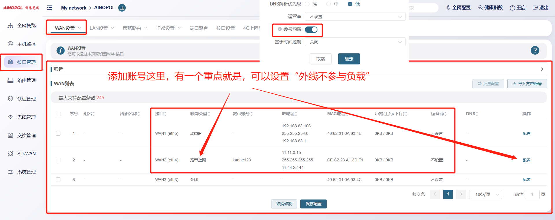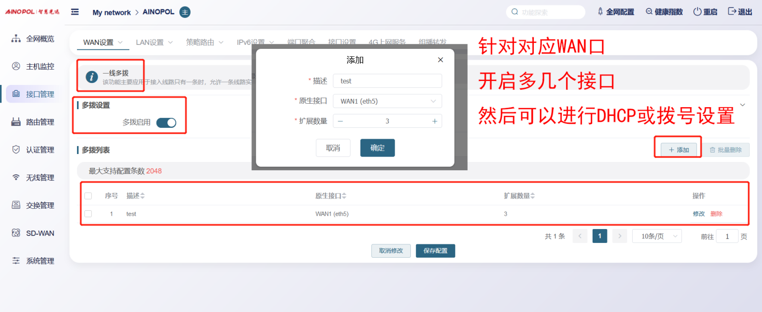 【产品教程】2026.03.23 融合路由 外线设置-WAN设置与一线多拨 默认添加WAN口的时候,可以添加为,静态IP/动态获取、PPPOE拨号等模式 ( 注,例如专线不需要加入负载的,可以“取消勾选参与负载” )  接口管理、一线多拨,设置一线多拨状态开启,为接口添加 虚拟多3个接口出来  给虚拟出来的3个接口,然后拨上账号 tip:创建后, 若初始拨号一直失败的情况下, 重启下路由系统  如果要设置外线 “定时重拨” ,编辑单个线路,高级设置,基于时间设置修改