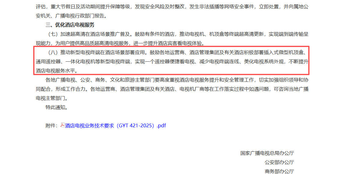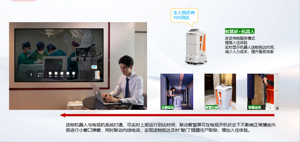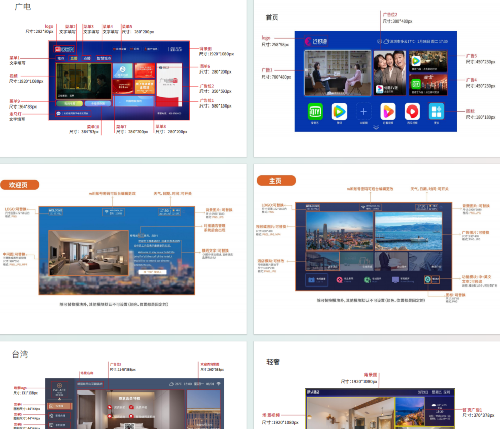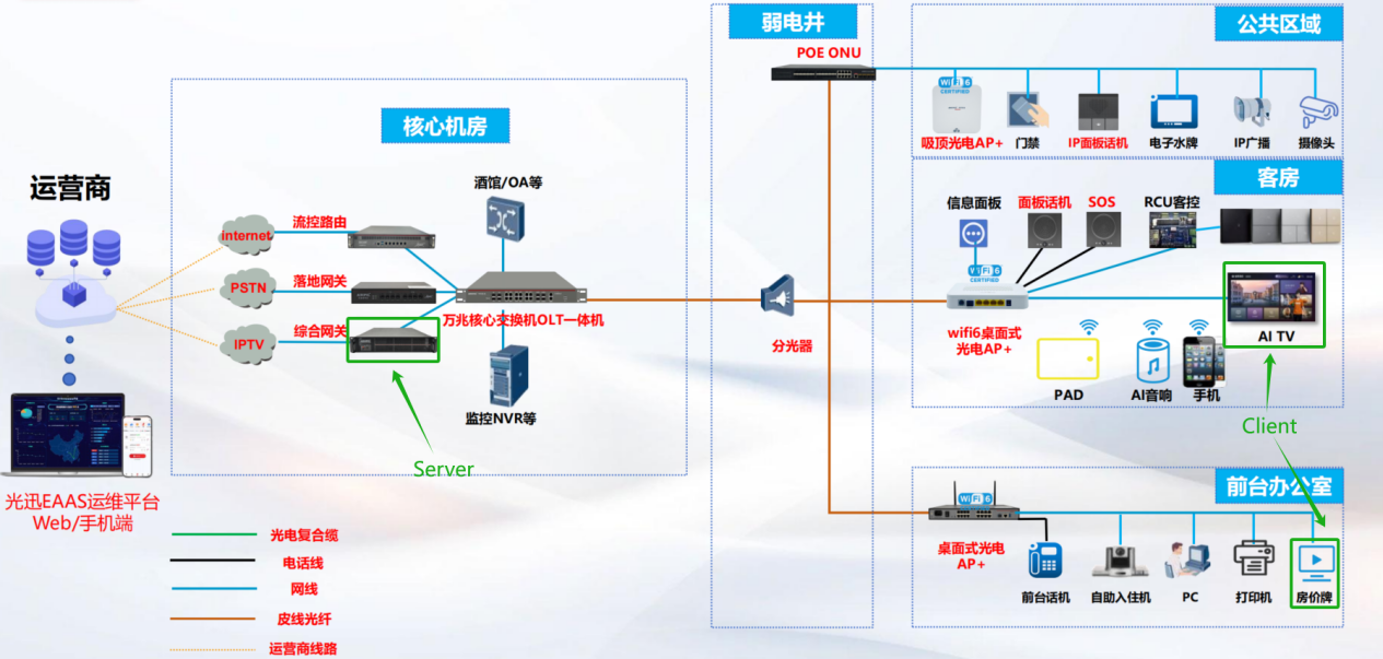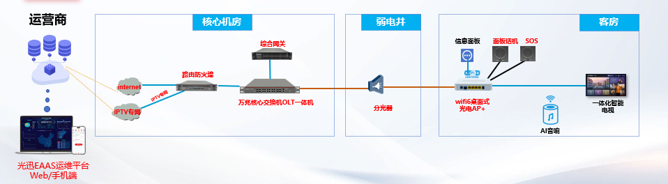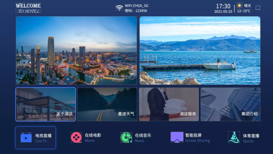 <center> **IPTV系统解决方案** **文档版本:C01V01R25P251103** **发布日期: 2025年11月3日** **发布处:深圳智慧光迅** </center> 目录 [一、系统拓扑图 4](#_Toc215154158) [二、C/S架构说明 6](#_Toc215154159) [1、Server服务端 6](#_Toc215154160) [2、Client客户端 7](#_Toc215154161) [三、IPTV服务器 8](#_Toc215154162) [1、本地服务器 8](#_Toc215154163) [2、云端服务器 8](#_Toc215154164) [四、电视桌面(智慧屏) 10](#_Toc215154165) [1、电视的启动过程 10](#_Toc215154166) [2、电视桌面的构成 11](#_Toc215154167) [3、APP版本 13](#_Toc215154168) [4、功能介绍 14](#_Toc215154169) [5、其他亮点 19](#_Toc215154170) [6、电视直播(流媒体) 21](#_Toc215154171) [五、其他知识 25](#_Toc215154172) **前言** 智慧光迅IPTV是基于行业标准的、在IP网络上传送视频及其他信息内容的平台,提供了智慧光迅IPTV流媒体服务器,内容分发网络,终端机顶盒(或安卓智能电视机)的端到端 IPTV解决方案。它允许业务提供商更快速有效的集成、实施和管理高质量的视频业务,分发到用户端给用户带来全新的业务体验。同时,智慧光迅IPTV 解决方案也为诸如付费点播业务以及订户计费模型等电子商务的集成提供了可靠的支持。 终端用户将从直观且又友好的用户界面得到极大的用户体验。用户界面提供了用户所有可用的内容和详细信息,更好的支持用户来挑选其感兴趣的内容进行观看,并且支持点播、暂停、重放以及快进等功能操作,用户可以随时随地的进行观看直播电视和点播视频内容,以及体验其他电视业务。 IPTV系统凭借自身出色的性能和深厚的技术背景,为业界所首肯和推崇。 IPTV 系统拥有多项诸如流媒体自适应技术、发送速率控制与平滑技术等国际先进的专利技术,在保证数字视频和数字电视直播、点播功能操作便捷的同时,也整合了电视台信息服务,使得房间用户 能体现到多样的高质量服务和用户体验。 # 一、系统拓扑图 根据运营商IPTV资源过来的形式,分为两种组网方式。 **方式一:广电清流** 广电清流信号源进入核心机房多业务综合网关,多业务综合网关权限开放至广电运维管理员,提供信号混合、分发以及电视UI桌面管理能力,如有境外节目时,来自境外卫星的射频信号在机房内分别接收、转换并输出IP信号,输入到多业务综合网关,通过内光分配网络传送至客房终端。同时外网路由器应该具备IPS、AV、WAF、上网日志存储等第二代防火墙功能,以确保机房安全保护等级应不低于第二级。(报装当地广电直播信号源)  **方式二:运营商IPTV专网(软终端)** 电信、联通、移动、广电等有资质的“IPTV软终端”提供商;将IPTV专网线路汇聚到核心机房的出口路由器;TV互动电视采用一体化智能电视,UI桌面由多业务综合网关或云桌面系统提供,TV互动电视桌面系统将运营商提供的“IPTV软终端”推送至桌面第一个功能模块,直播信号源由出口路由器转发至IPTV专网。   # 二、C/S架构说明 IPTV系统架构分为客户端和服务器两个部分。客户端负责发起请求并与用户进行交互,而服务器则负责接收客户端的请求、处理数据,并将结果返回给客户端。  ## 1、Server服务端 **内容存储和管理:**服务器存储大量的视频节目和其他内容,并负责内容的管理、更新和维护。 **流媒体传输:**服务器将用户请求的内容以流媒体的形式传输给客户端,支持实时和非实时的观看需求。  备:本地服务器一般部署在内网内。云端服务器分为两种:a)第三方云服务。b)商旅云屏。 ## 2、Client客户端 **发起请求:**客户端是用户与IPTV系统交互的接口,用户通过客户端发起观看节目、查询信息等请求。 **接收和展示内容:**客户端接收服务器发送的流媒体数据和其他信息,并将其展示给用户,如视频画面、音频内容以及电子节目指南(EPG)等。 **用户交互:**客户端提供用户界面,允许用户进行各种操作,如选择节目、调整音量、快进/后退等。 备:客户端只需要认证好对应的服务器即可  # 三、IPTV服务器 ## 1、本地服务器 IPTV本地服务器部署在本地局域网本地,为局域网的设备提供软硬一体的IPTV服务,本地服务器一共有以下型号,根据项目类型以及实际的终端数量进行计算,选择最合适的服务器。 | **型号** | **智慧屏授权** | **推荐场景** | | --- | --- | --- | | ZH\-ITV55/A50 | 70 | 70 | | ZH\-H100 | 无限制 | 130 | | ZH\-H200 | 无限制 | 280 | | ZH\-H500 | 无限制 | 1000 | | ZH\-HA1 | 无限制 | 2000 | 备:有一种特殊的情况,运营自建服务器,指客户使用自己的服务器进行IPTV服务的部署,一般用在运营场景下,比如园区、小区等中大型场景,在这个过程中我们只出售软件授权,一般出售给有一定运营经验的服务商。  ## 2、云端服务器 云服务器不部署在局域网本地,通过将服务器部署在数据机房,终端认证云服务器的方式,可有效的节省IPTV系统的部署成本,适用于离散式场景或者运营场景。 * **三方云服务** 免费帮助需要搭建云服务器的客户进行服务的搭建,客户需要自行购买好对应的云服务器,后续由技术团队部署云服务器,可搭建包括但不限于以下云服务。不具备电视直播功能,可搭配具备直播代播功能的路由器进行使用。  * **商旅云屏** 智慧光迅IPTV云桌面,云桌面仅提供电视桌面服务,不具备直播功能,可搭配具备直播代播功能的路由器进行使用。  # 四、电视桌面(智慧屏) IPTV 电视桌面是用户打开IPTV电视后看到的交互界面,集成功能入口、展示多种内容,还支持