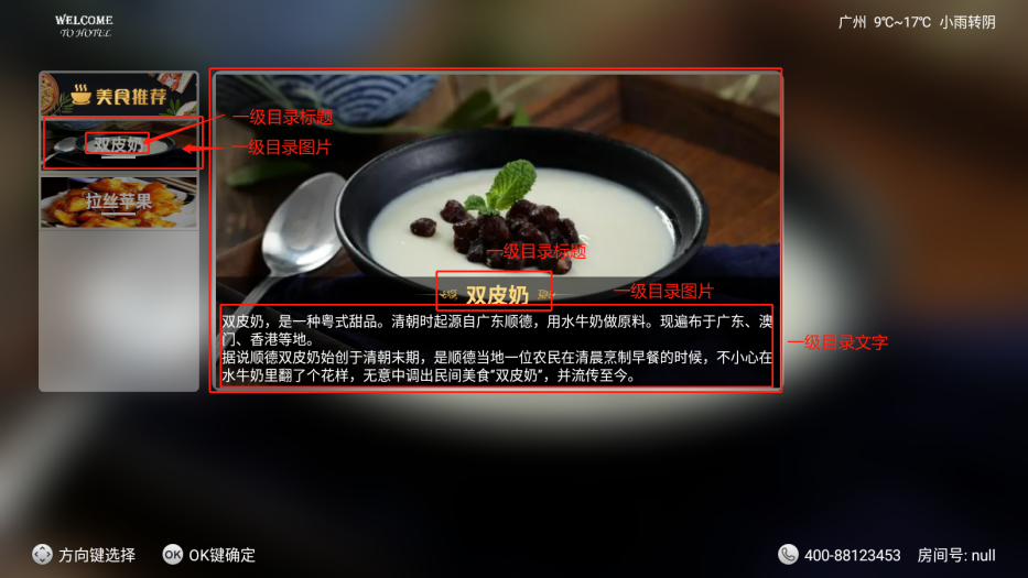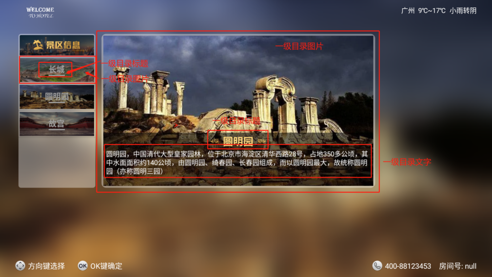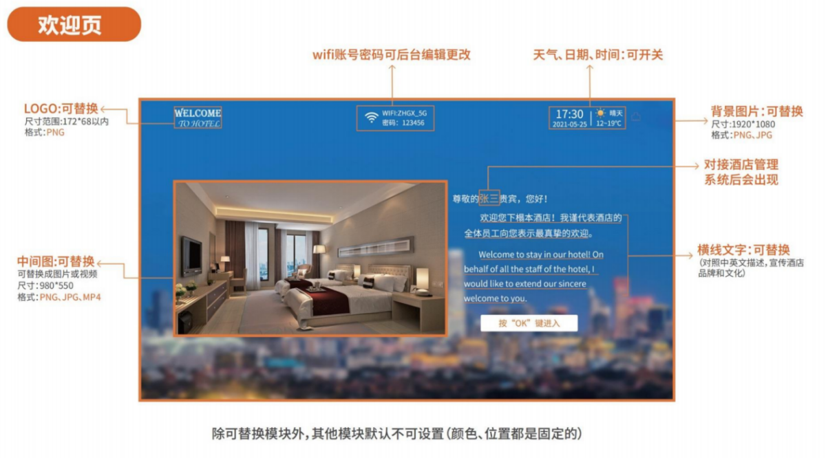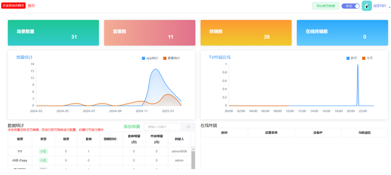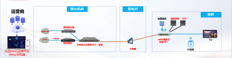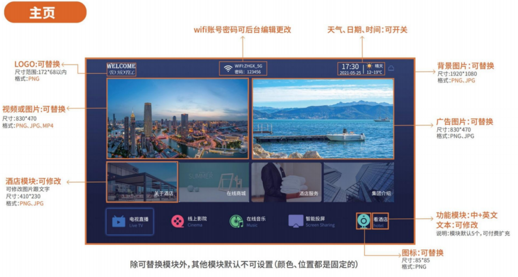 <center> **IPTV系统解决方案** **文档版本:C01V01R25P251103** **发布日期: 2025年11月3日** **发布处:深圳智慧光迅** </center> 目录 [一、系统拓扑图 4](#_Toc215154158) [二、C/S架构说明 6](#_Toc215154159) [1、Server服务端 6](#_Toc215154160) [2、Client客户端 7](#_Toc215154161) [三、IPTV服务器 8](#_Toc215154162) [1、本地服务器 8](#_Toc215154163) [2、云端服务器 8](#_Toc215154164) [四、电视桌面(智慧屏) 10](#_Toc215154165) [1、电视的启动过程 10](#_Toc215154166) [2、电视桌面的构成 11](#_Toc215154167) [3、APP版本 13](#_Toc215154168) [4、功能介绍 14](#_Toc215154169) [5、其他亮点 19](#_Toc215154170) [6、电视直播(流媒体) 21](#_Toc215154171) [五、其他知识 25](#_Toc215154172) **前言** 智慧光迅IPTV是基于行业标准的、在IP网络上传送视频及其他信息内容的平台,提供了智慧光迅IPTV流媒体服务器,内容分发网络,终端机顶盒(或安卓智能电视机)的端到端 IPTV解决方案。它允许业务提供商更快速有效的集成、实施和管理高质量的视频业务,分发到用户端给用户带来全新的业务体验。同时,智慧光迅IPTV 解决方案也为诸如付费点播业务以及订户计费模型等电子商务的集成提供了可靠的支持。 终端用户将从直观且又友好的用户界面得到极大的用户体验。用户界面提供了用户所有可用的内容和详细信息,更好的支持用户来挑选其感兴趣的内容进行观看,并且支持点播、暂停、重放以及快进等功能操作,用户可以随时随地的进行观看直播电视和点播视频内容,以及体验其他电视业务。 IPTV系统凭借自身出色的性能和深厚的技术背景,为业界所首肯和推崇。 IPTV 系统拥有多项诸如流媒体自适应技术、发送速率控制与平滑技术等国际先进的专利技术,在保证数字视频和数字电视直播、点播功能操作便捷的同时,也整合了电视台信息服务,使得房间用户 能体现到多样的高质量服务和用户体验。 # 一、系统拓扑图 根据运营商IPTV资源过来的形式,分为两种组网方式。 **方式一:广电清流** 广电清流信号源进入核心机房多业务综合网关,多业务综合网关权限开放至广电运维管理员,提供信号混合、分发以及电视UI桌面管理能力,如有境外节目时,来自境外卫星的射频信号在机房内分别接收、转换并输出IP信号,输入到多业务综合网关,通过内光分配网络传送至客房终端。同时外网路由器应该具备IPS、AV、WAF、上网日志存储等第二代防火墙功能,以确保机房安全保护等级应不低于第二级。(报装当地广电直播信号源)  **方式二:运营商IPTV专网(软终端)** 电信、联通、移动、广电等有资质的“IPTV软终端”提供商;将IPTV专网线路汇聚到核心机房的出口路由器;TV互动电视采用一体化智能电视,UI桌面由多业务综合网关或云桌面系统提供,TV互动电视桌面系统将运营商提供的“IPTV软终端”推送至桌面第一个功能模块,直播信号源由出口路由器转发至IPTV专网。   # 二、C/S架构说明 IPTV系统架构分为客户端和服务器两个部分。客户端负责发起请求并与用户进行交互,而服务器则负责接收客户端的请求、处理数据,并将结果返回给客户端。  ## 1、Server服务端 **内容存储和管理:**服务器存储大量的视频节目和其他内容,并负责内容的管理、更新和维护。 **流媒体传输:**服务器将用户请求的内容以流媒体的形式传输给客户端,支持实时和非实时的观看需求。  备:本地服务器一般部署在内网内。云端服务器分为两种:a)第三方云服务。b)商旅云屏。 ## 2、Client客户端 **发起请求:**客户端是用户与IPTV系统交互的接口,用户通过客户端发起观看节目、查询信息等请求。 **接收和展示内容:**客户端接收服务器发送的流媒体数据和其他信息,并将其展示给用户,如视频画面、音频内容以及电子节目指南(EPG)等。 **用户交互:**客户端提供用户界面,允许用户进行各种操作,如选择节目、调整音量、快进/后退等。 备:客户端只需要认证好对应的服务器即可  # 三、IPTV服务器 ## 1、本地服务器 IPTV本地服务器部署在本地局域网本地,为局域网的设备提供软硬一体的IPTV服务,本地服务器一共有以下型号,根据项目类型以及实际的终端数量进行计算,选择最合适的服务器。 | **型号** | **智慧屏授权** | **推荐场景** | | --- | --- | --- | | ZH\-ITV55/A50 | 70 | 70 | | ZH\-H100 | 无限制 | 130 | | ZH\-H200 | 无限制 | 280 | | ZH\-H500 | 无限制 | 1000 | | ZH\-HA1 | 无限制 | 2000 | 备:有一种特殊的情况,运营自建服务器,指客户使用自己的服务器进行IPTV服务的部署,一般用在运营场景下,比如园区、小区等中大型场景,在这个过程中我们只出售软件授权,一般出售给有一定运营经验的服务商。  ## 2、云端服务器 云服务器不部署在局域网本地,通过将服务器部署在数据机房,终端认证云服务器的方式,可有效的节省IPTV系统的部署成本,适用于离散式场景或者运营场景。 * **三方云服务** 免费帮助需要搭建云服务器的客户进行服务的搭建,客户需要自行购买好对应的云服务器,后续由技术团队部署云服务器,可搭建包括但不限于以下云服务。不具备电视直播功能,可搭配具备直播代播功能的路由器进行使用。  * **商旅云屏** 智慧光迅IPTV云桌面,云桌面仅提供电视桌面服务,不具备直播功能,可搭配具备直播代播功能的路由器进行使用。  # 四、电视桌面(智慧屏) IPTV 电视桌面是用户打开IPTV电视后看到的交互界面,集成功能入口、展示多种内容,还支持
