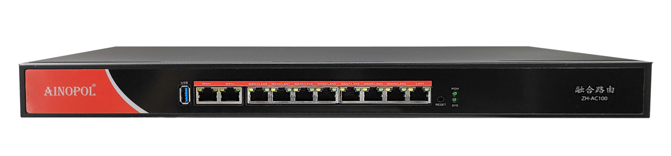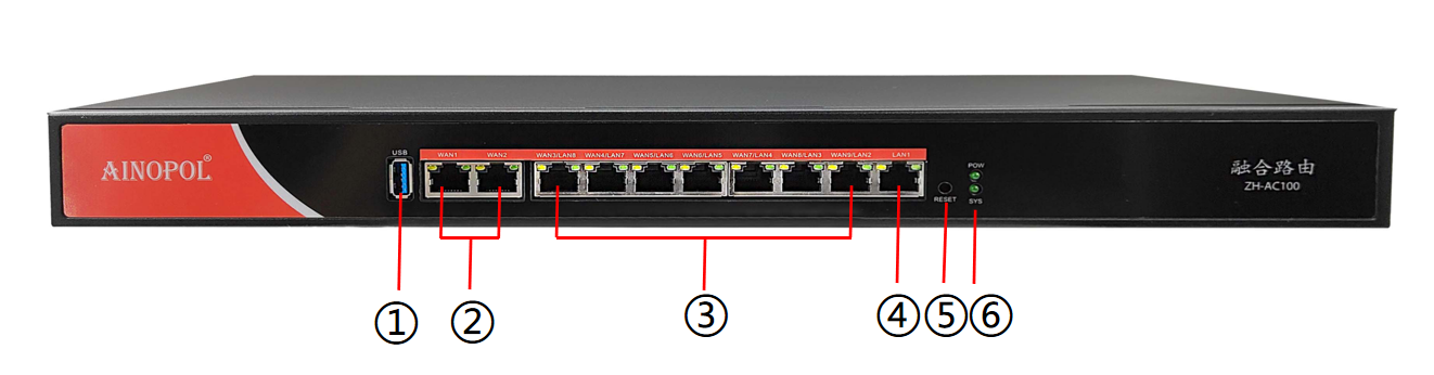 融合路由硬件说明 设备型号:ZH-AC100 设备参数:19寸机架式融合路由(质保3年) 10*10/100/1000M电口(WAN/LAN自由切换) 1\*USB3.0接口 内置电源 100-240V AC50/60Hz 功耗<20瓦 产品尺寸:440\*221\*44mm 产品重量:2.25kg 工作温度:-10℃~65℃ 产品外观及硬件规格说明:  图1 ZH-AC100 产品正面  图2 ZH-AC100 产品背面 1、接口说明  ①:USB3.0接口:可接入U盘、键盘、鼠标等设备。常用于服务器初始化、重新写入使用。 ②:网口接口(WAN):RJ45网口,两个固定WAN口。 ③:网口接口:RJ45网口,七个LAN/WAN口,可自行设置。 ④:网口接口(LAN):RJ45网口,一个固定LAN口。 ⑤:RESET键:复位键,可恢复出厂设置。 ⑤: SYS指示灯(绿):设备系统指示灯,系统启动时闪烁。 POW指示灯(绿):设备电源指示灯,正常运行时常亮。  ⑦:接地 ⑧:电源接口:内置电源 100-240V AC50/60Hz
