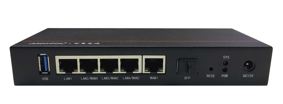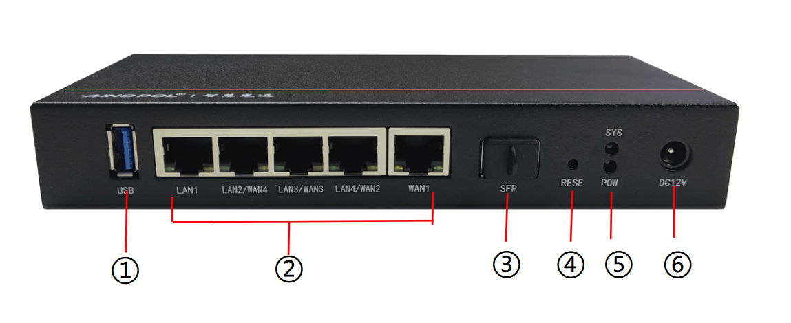 融合路由硬件说明 设备型号:ZH-AC100(Ultra) MINI 设备参数:桌面式融合路由(质保3年) 5\*10/100/1000M电口(WAN/LAN自由切换) 1\*100/1000M SFP光口(WAN/LAN自由切换) 1\*USB3.0接口 内置电源 100-240V AC50/60Hz 功耗<10瓦 产品尺寸:178\*95\*30mm 产品重量:0.4kg 工作温度:-10℃~65℃ 产品外观及硬件规格说明:  图1 ZH-AC100(Ultra)MINI产品正面  图2 ZH-AC100(Ultra)MINI产品背面 1、接口说明  ①:USB3.0接口:可接入U盘、键盘、鼠标等设备。常用于服务器初始化、重新写入使用。 ②:网口接口:RJ45网口,左1为固定lan口,右1为固定wan口,其余三网口可自定义lan/wan口。 ③:网口接口:SFP光口,可自定义lan/wan口。 ④:RESET键:复位键,可恢复出厂设置。 ⑤: SYS指示灯(绿):设备系统指示灯,系统启动时闪烁。 POW指示灯(绿):设备电源指示灯,正常运行时常亮。 ⑥:电源接口:DC 12V
