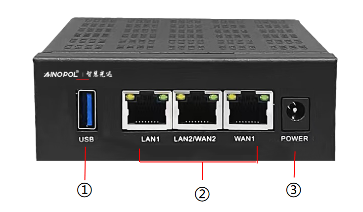 融合路由硬件说明 设备型号:ZH-AC200R(LI) 设备参数:桌面式融合路由(质保3年) 3*10/100/1000M电口) 1\*USB3.0接口 外置电源:DC 12V 1.5A 功耗<30瓦 产品尺寸: 产品重量: 工作温度:-10℃~65℃ 产品外观及硬件规格说明:  图1 ZH-AC200R(LI)产品正面 1、接口说明  ①:USB3.0接口:可接入U盘、键盘、鼠标等设备。常用于服务器初始化、重新写入使用。 ②:网口接口:RJ45网口,左1为固定lan口,右1为固定wan口,其余网口可自定义lan/wan口。 ③:电源接口:DC 12V 1.5A