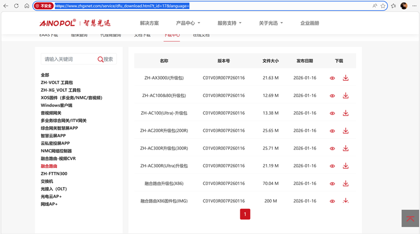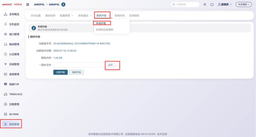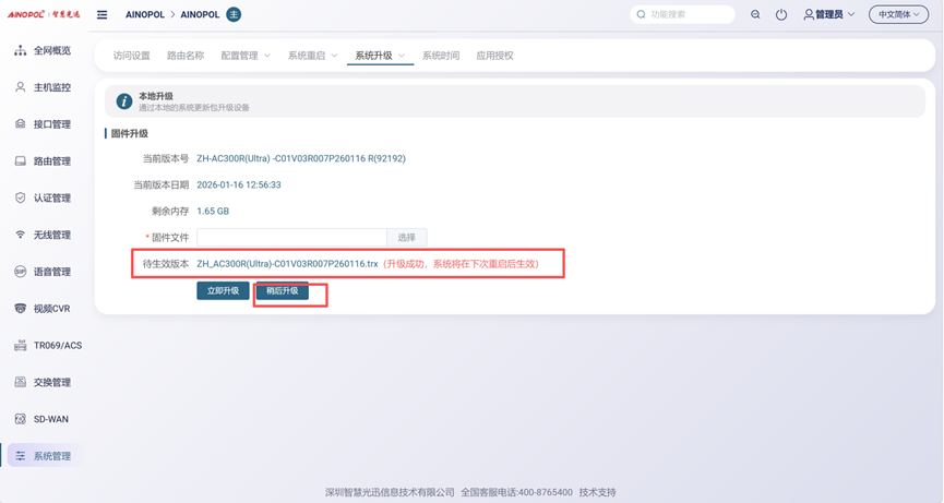 【产品教程】2026.03.24 融合路由-系统管理-系统升级 需要升级路由器版本时,先从官网([智慧光迅 | AinOPOL——全球领先的光电融合通信解决方案提供商(绿色、融合、安全)](https://www.zhgxnet.com/service/dfu_download.html?t_id=17&language=))下载对应的融合路由升级包。注意:不同架构的路由器升级包不同,升级前务必核对设备的架构和型号,确保与下载的版本一致。  将对应的升级文件下载到电脑后,如下图所示,选择相应的升级文件,然后可根据需要选择“立即升级”或“稍后升级”。  注意:如果选择“稍后升级”,融合路由会先上传升级包。待升级包上传完成后,路由器在下次重启时将自动应用并更新为最新版本。(可以参考定时重启教程设置)