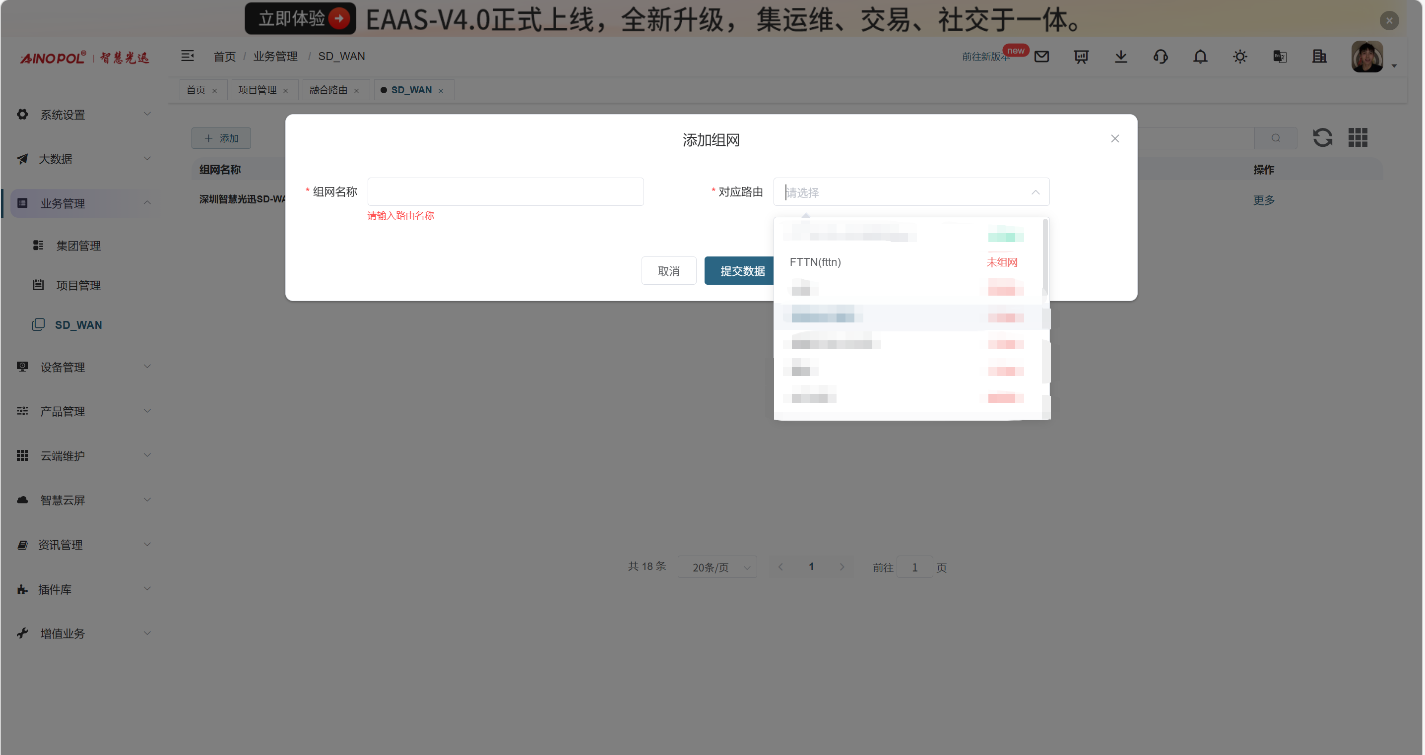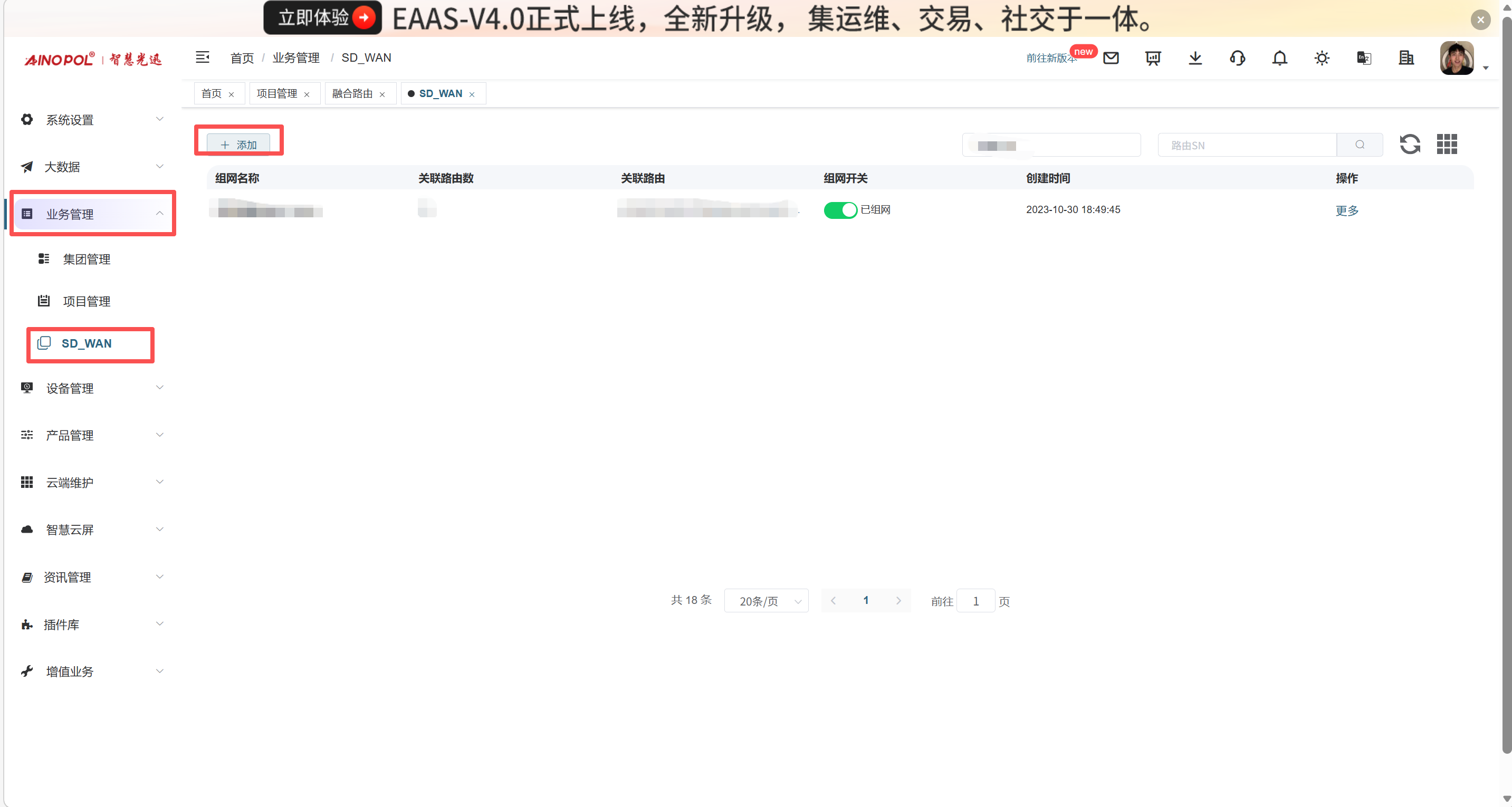 【产品教程】2026.03.24 融合路由-SD-WAM 虚拟局域网功能使用前,需先在 EAAS 平台开启 SD-WAN 功能,然后将需要组建 SD-WAN 的两台路由器加入同一个虚拟局域网。注意:A、B 两台路由器之间的内网网段不能相同,否则会导致路由表错乱。  如下图所示,组网名称可以自定义。对应的路由需要手动选择两台需要组网的融合路由(可通过搜索 EAAS 端路由器备注名称快速筛选)。  在 EAAS 平台将两台路由添加完成后,登录融合路由的 Web 管理界面,开启 SD-WAN 功能即可。