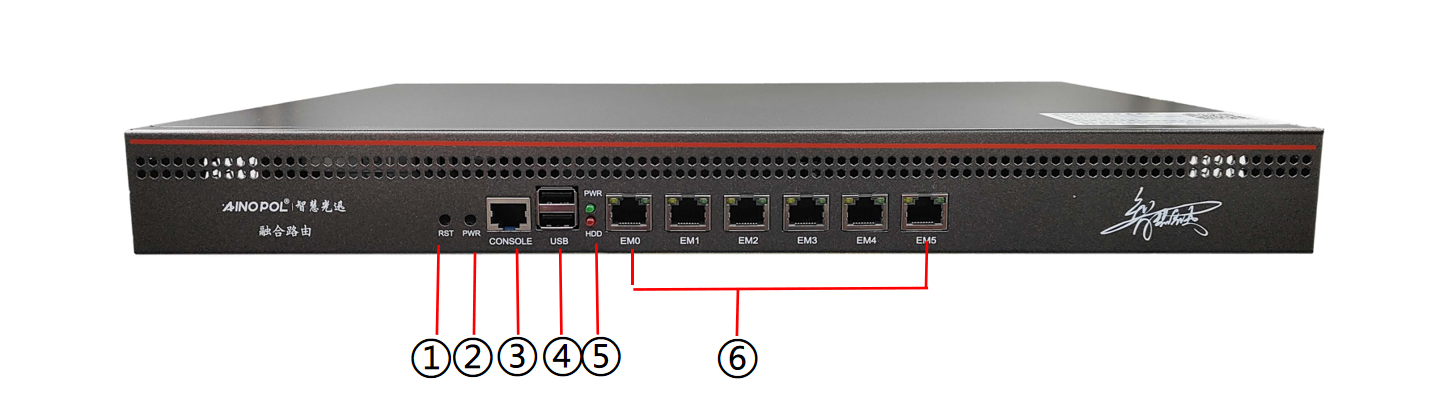 融合路由硬件说明 设备型号:ZH-AC200S 设备参数:19寸桌面式融合路由(质保3年) 6*10/100/1000M电口 2*USB2.0接口 1*CONSOLE接口 内置电源 100-240V AC50/60Hz 功耗<30瓦 产品尺寸:430\*300\*45mm 产品重量:2.85kg 工作温度:-10℃~65℃ 产品外观及硬件规格说明:  图1 ZH-AC200S产品正面  图2 ZH-AC200S产品背面 1、接口说明  ①:RESET键:复位键,可恢复出厂设置。 ②:PWR键: ③:CONSOLE口:调试口 ④:USB3.0接口:可接入U盘、键盘、鼠标等设备。常用于服务器初始化、重新写入使用。 ⑤: PWR指示灯(绿):设备电源指示灯,正常运行时常亮。 HDD指示灯(红):设备硬盘指示灯,闪烁则代表在读写数据。 ⑥:网口接口:6\*RJ45网口,可自定义lan/wan口。  ⑦:接地 ⑧:风扇 ⑨:电源开关 ⑩:电源接口:内置电源 100-240V AC50/60Hz