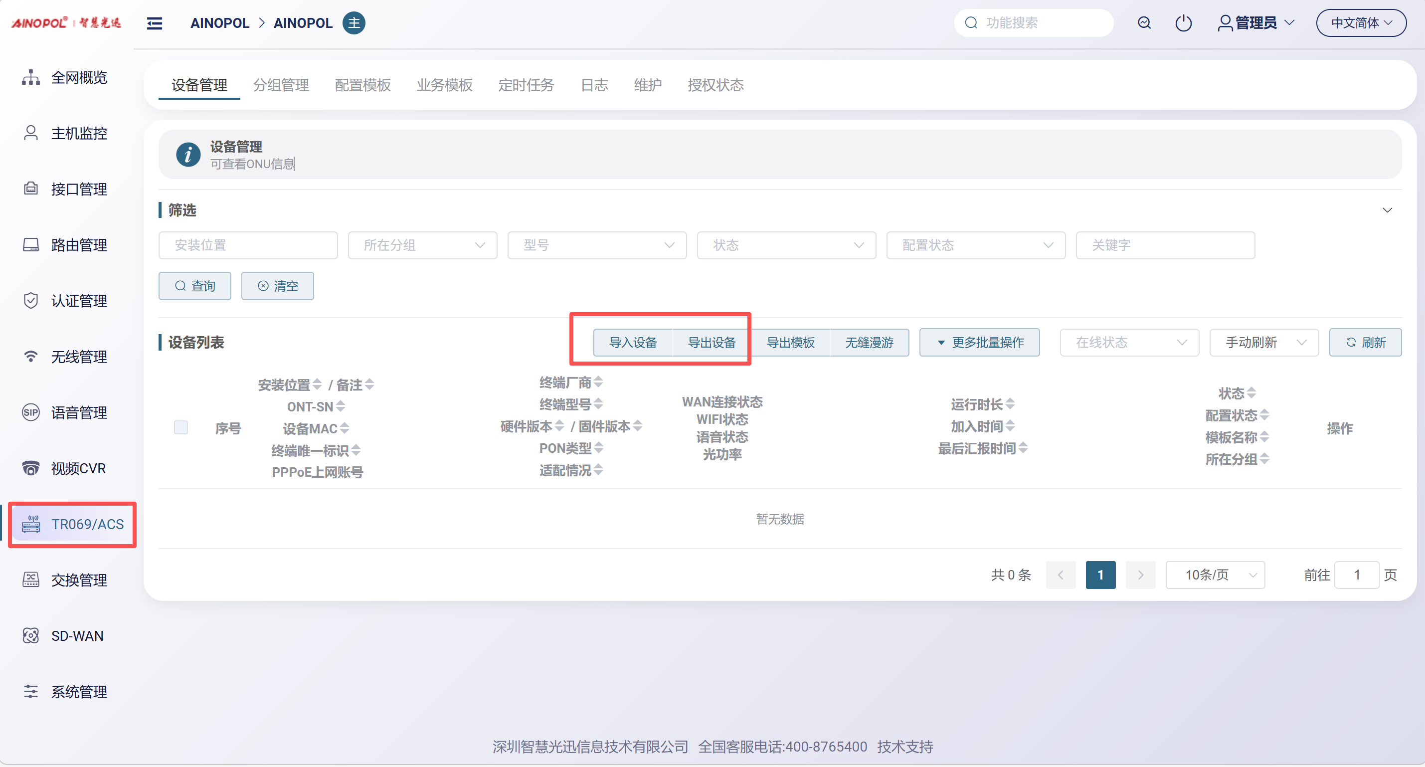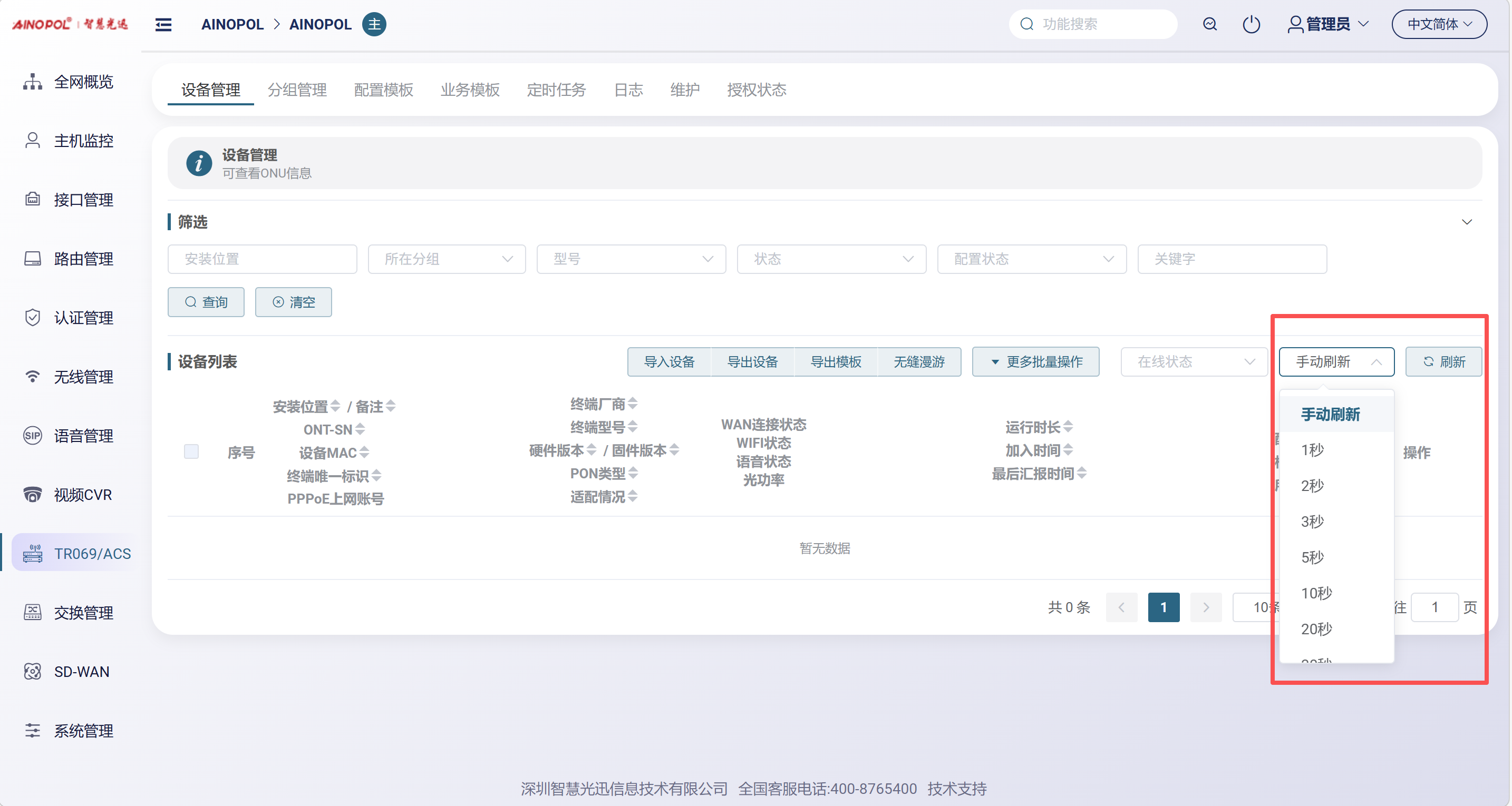 【产品教程】2026.03.25 融合路由-TR069/ACS-设备管理 这里可以根据位置、光猫的 MAC 地址、SN 等信息来搜索并定位某一个光猫。  这里也支持批量导入和导出光猫信息,主要包括光猫的 MAC 地址、SN、安装位置等内容,便于统一管理和维护。  模板如下图所示,按照模板将光猫信息填写完整后直接导入即可(配置信息可不填写,例如 SSID、无线密码等)。  这是导入模板的下载入口,从这里下载模板后,填写完成并保存,再导入到融合路由即可。  下图为光猫无线漫游的阈值配置信息,对于对无线不熟悉的用户,建议保持默认配置即可。  如下操作可对光猫执行配置下发、重启、恢复出厂、解除限制等,同时也可以将光猫迁移到不同分组。不同分组有助于后续管理和维护。  这里可以根据光猫的上线时间进行筛选,将符合条件的光猫显示在管理界面中,便于快速查找和管理。  这里指的是光猫操作后的业务刷新时间。默认是手动刷新,配置完成后可点击右侧刷新按钮生效,也可以设置自动刷新,刷新间隔可自定义。