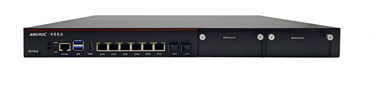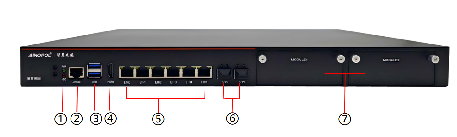 融合路由硬件说明 设备型号:ZH-AC500(Ultra) 设备参数:19寸1U机架插卡式万兆融合路由 6*10/100/1000/2500M电口 2*10GE光口 2个板卡扩展槽位 2*USB端口2.0 1*CONSOLE接口 内置电源 100-240V AC50/60Hz 功耗<50瓦 产品尺寸:440\*472\*43mm 产品重量:6.7kg 工作温度:-10℃~65℃ 产品外观及硬件规格说明:  图1 ZH-AC500(Ultra)产品正面  图2 ZH-AC500(Ultra)产品背面 1、接口说明  ①: PWR指示灯(绿):设备电源指示灯,正常运行时常亮。 HDD指示灯(红):设备硬盘指示灯,闪烁则代表在读写数据。 ②:CONSOLE口:调试口 ③:USB3.0接口:可接入U盘、键盘、鼠标等设备。常用于服务器初始化、重新写入使用。 ④:HDMI接口:可用于外界显示器 ⑤:网口接口:6\*RJ45网口,可自定义lan/wan口。 ⑥:网口接口:2\*SFP+光口,可自定义lan/wan口。 ⑦:板卡扩展槽位:可拓展2\*10G SFP+光口业务子卡、4\*10G SFP+光口业务子卡、4\*2.5G电口业务子卡  ⑧:接地 ⑨:VGA接口:可以用于外接显示器 ⑩:风扇 ⑪:电源接口:内置电源 100-240V AC50/60Hz