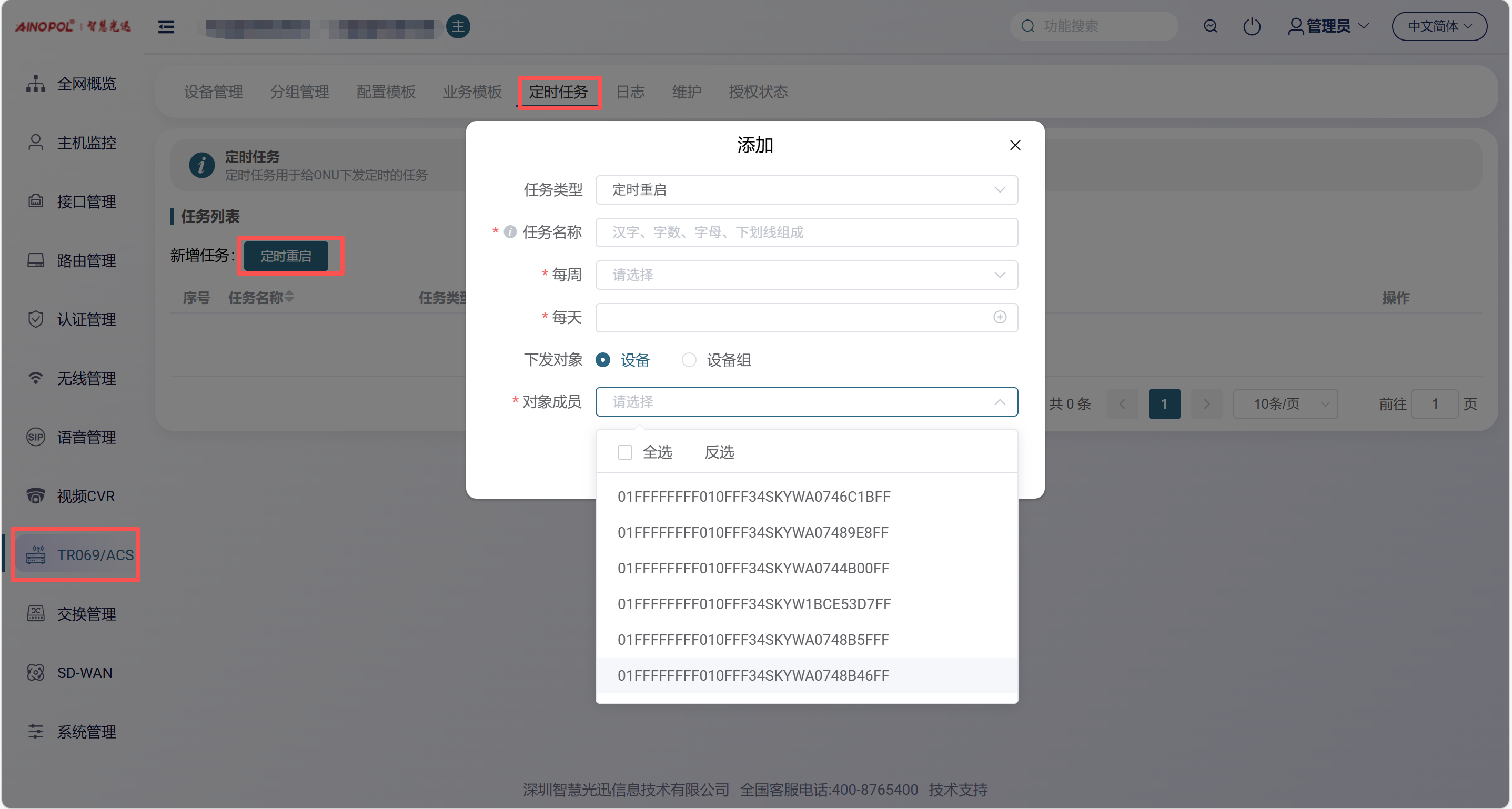 【产品教程】2026.03.25 融合路由-TR069/ACS-定时任务 这里可以给光猫设置定时重启 任务名称可自定义,可设置周内哪一天及具体时间点重启,如下图所示,根据光猫的唯一标识选择需要重启的设备即可。