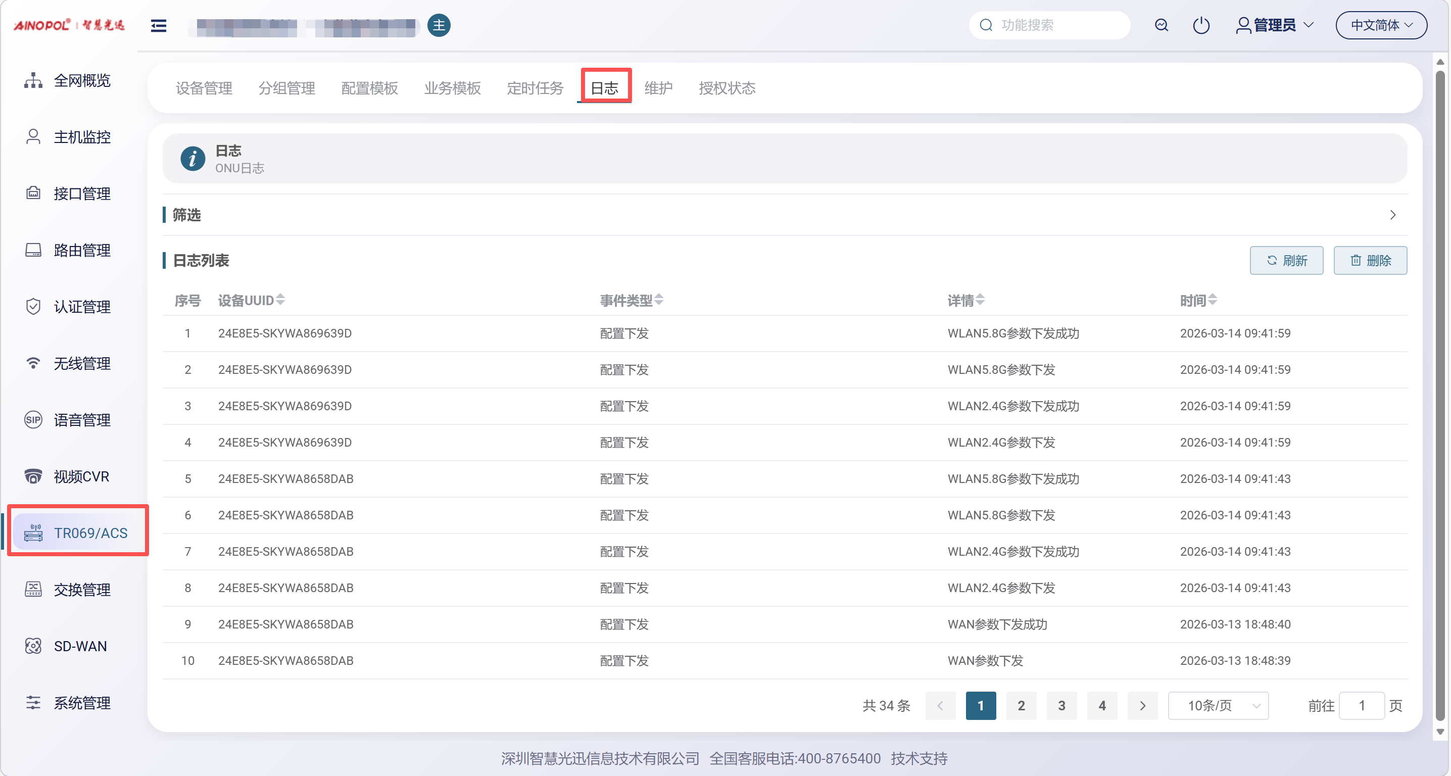 【产品教程】2026.03.25 融合路由-TR069/ACS-日志 这里的日志主要用于查看光猫配置下发是否成功,包括光猫是否重新下发模板、配置模板是否被修改等操作,TR069 中的任何操作都会在此留下记录。