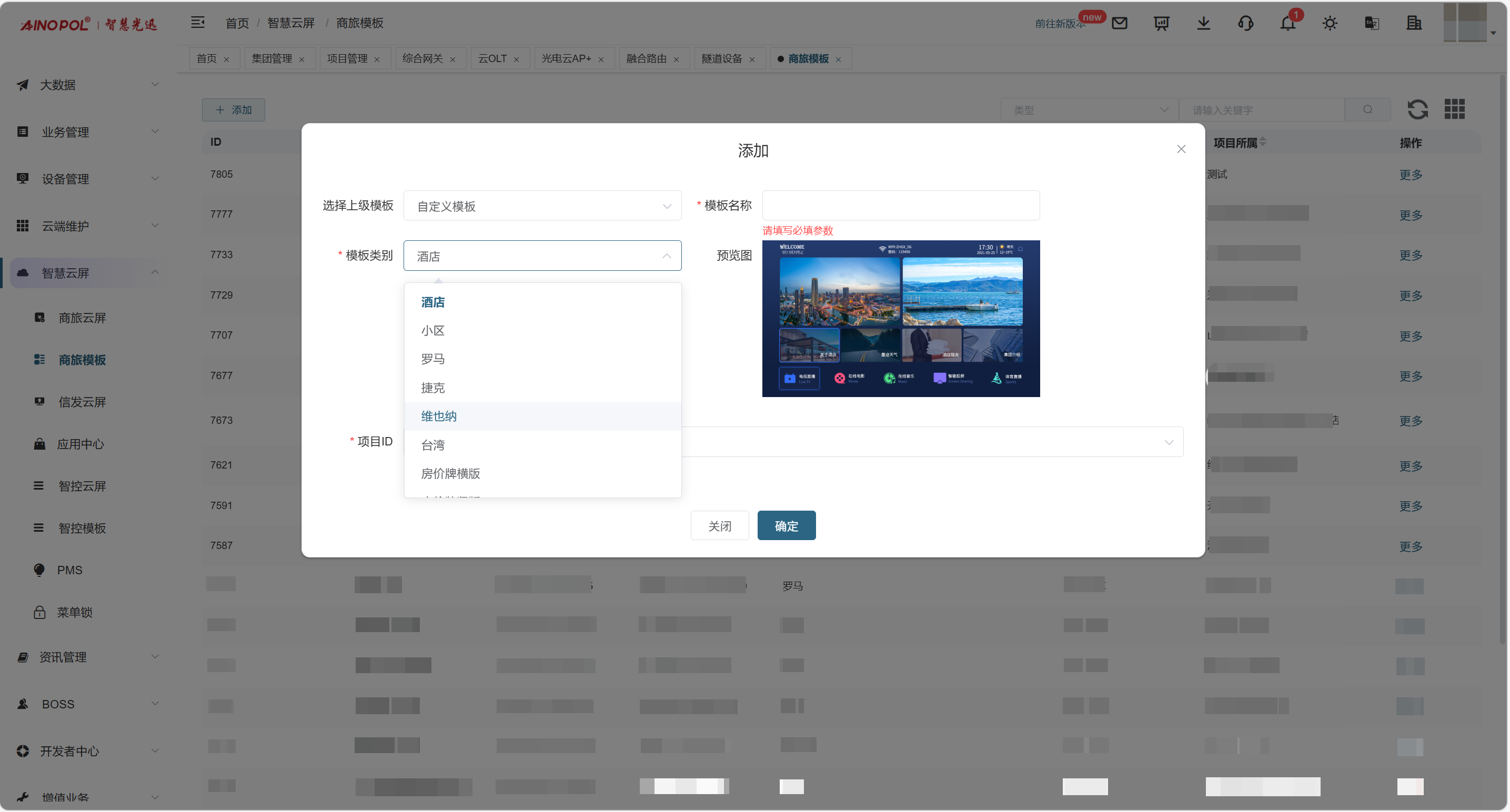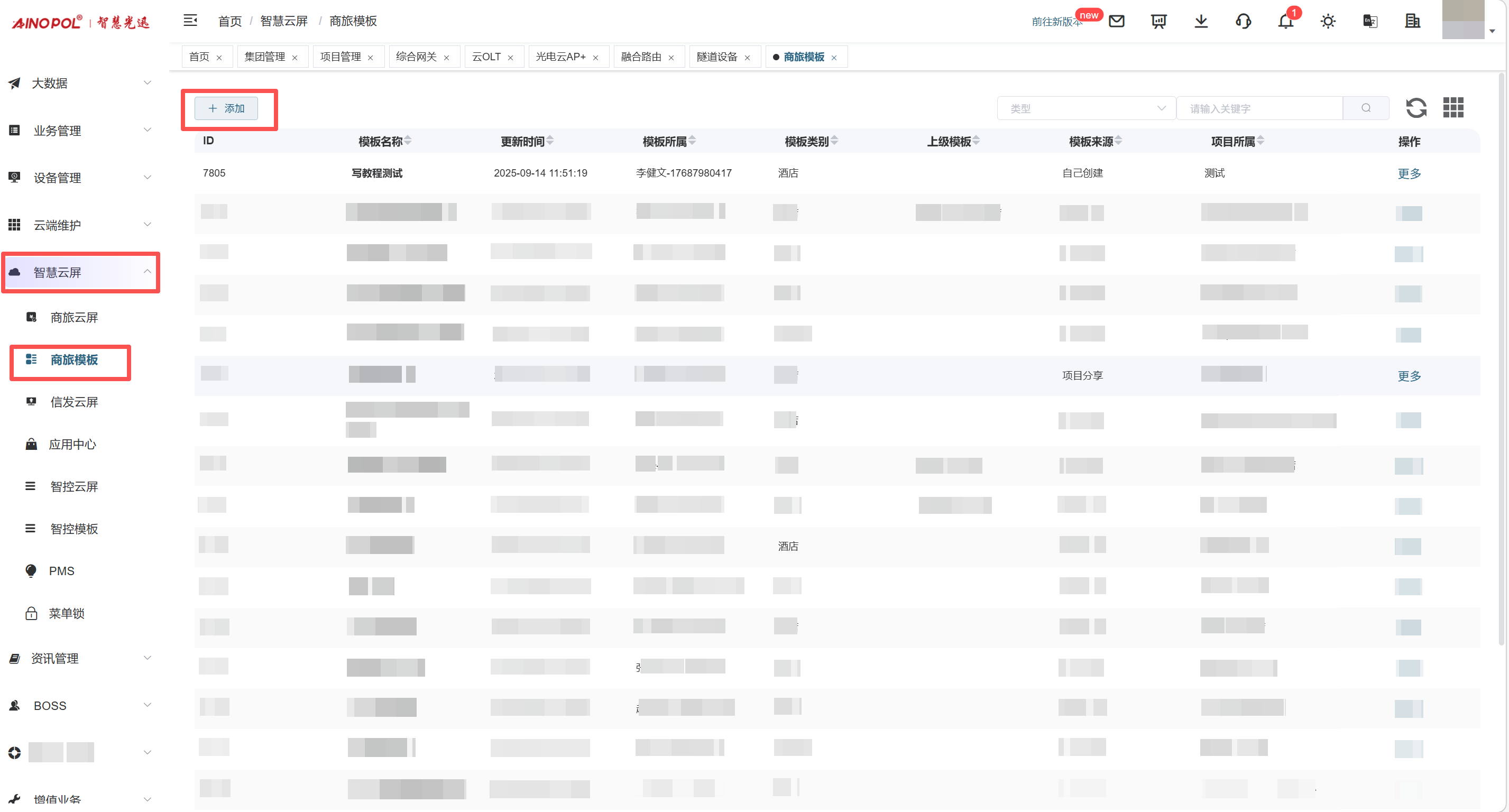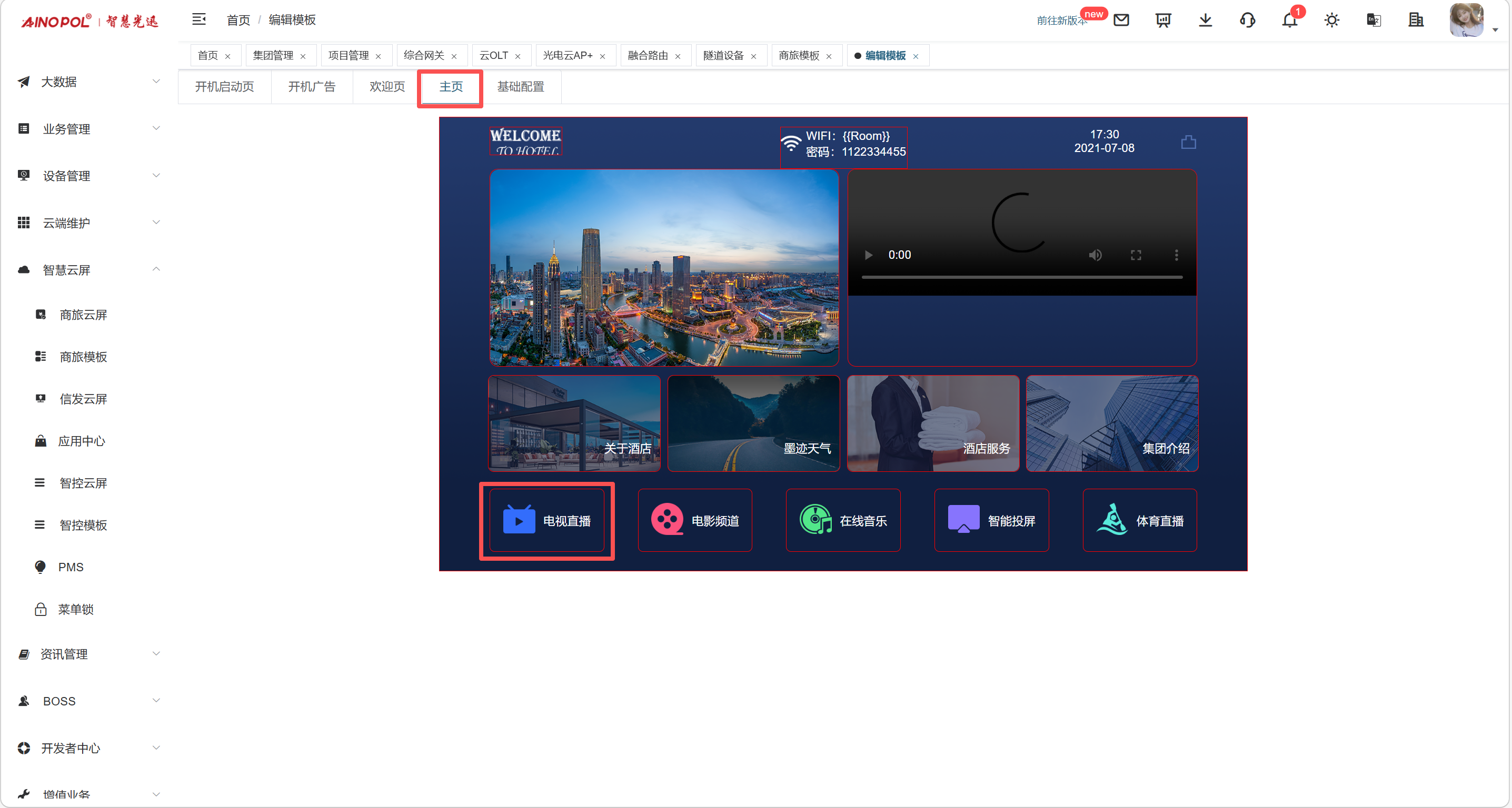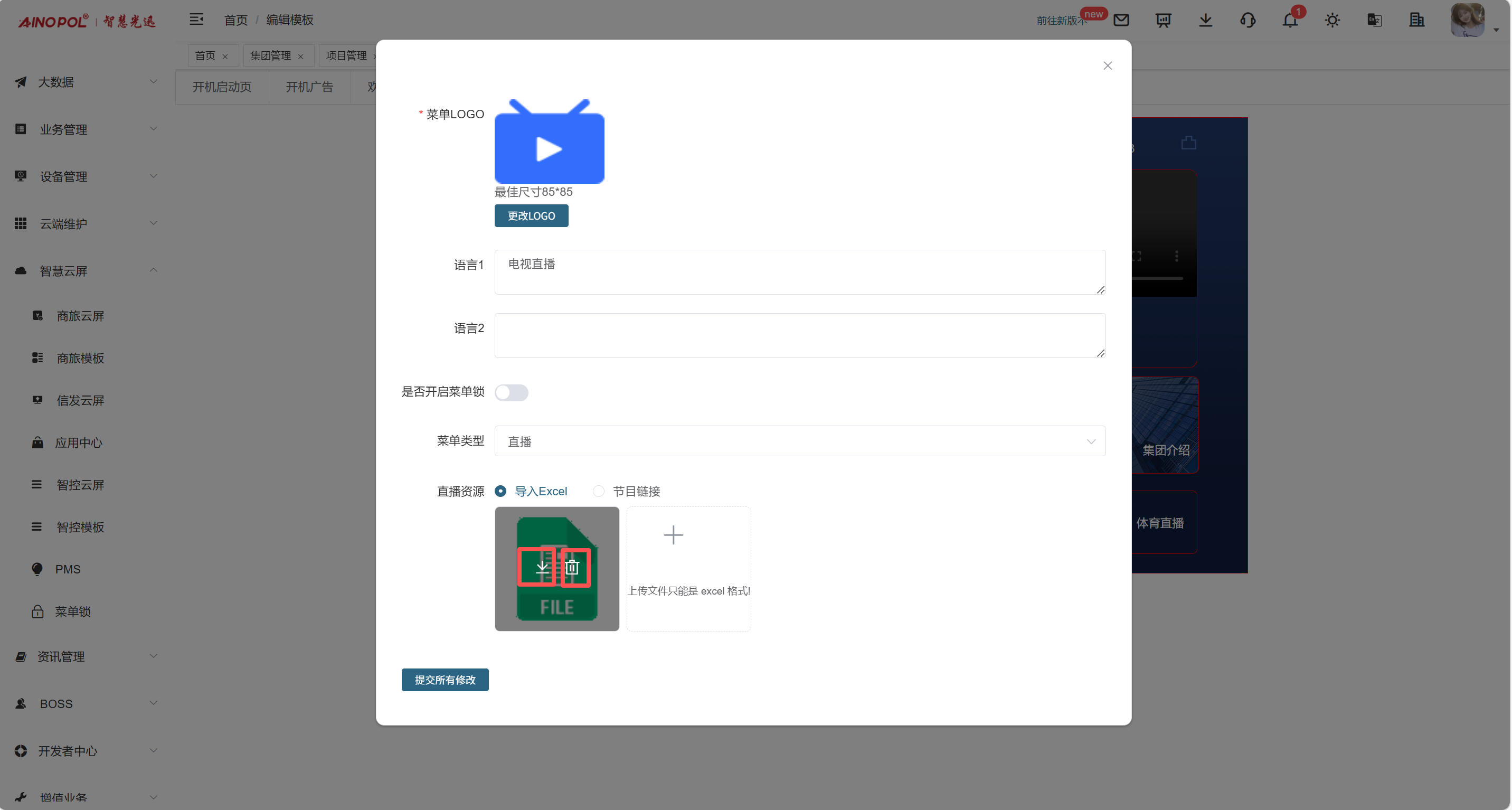 【产品教程】2026.03.25 融合路由-无线管理-创建云屏模板 首先,登录我们的 EAAS 账号并创建一个新的云屏模板。  创建模板时,上级模板选择“自定义”,填写模板名称,自行根据项目需求选择模板类别,并在最下方选择需要创建模板的项目ID。然后点击更多里面的编辑进去配置内容。  登录后,如下图所示,点击“看电视”即可进入配置节目的界面。  最后,先下载原有的表格模板并删除原表格,然后根据表格内容填写好组合地址,完成后上传到模板即可。  模板配置完成后,进入智慧云屏管理界面,选中所有云屏并下发配置,即可完成全部操作。