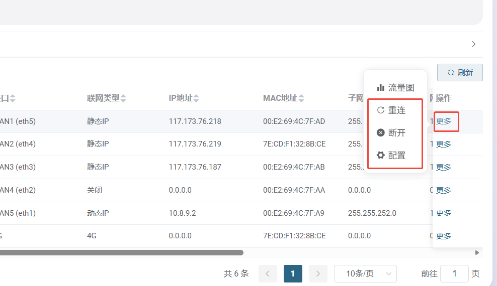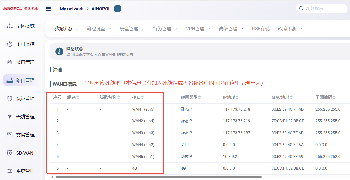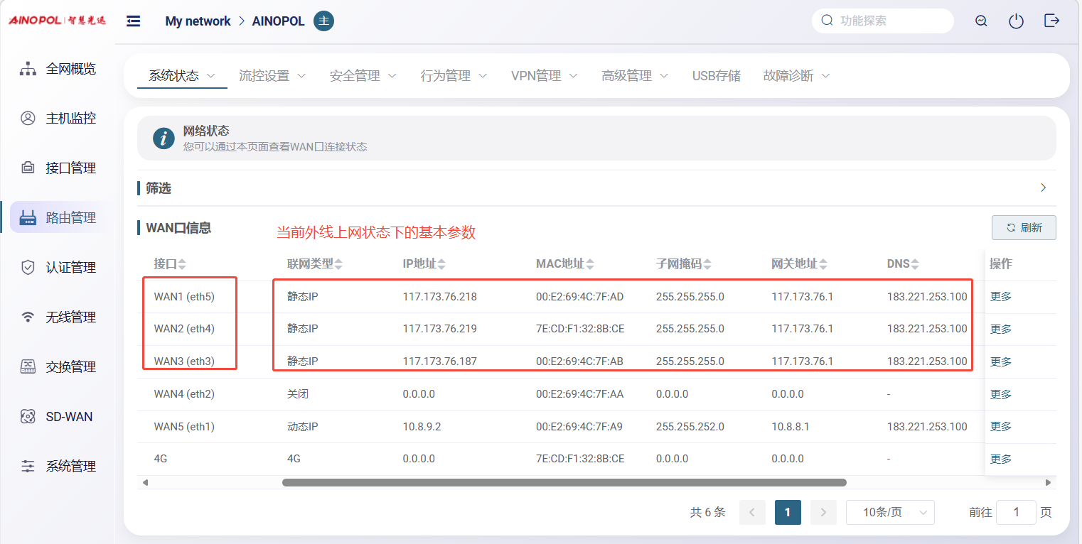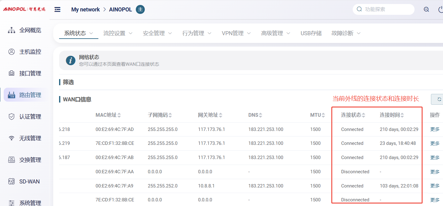 【产品教程】2026.03.25 融合路由-状态管理-系统状态-网络状态 操作背景:通过网络状态,快速分析外网拨号成功的IP地址与掩码,和运营商提供的DNS参数(右边可以点击立即重播) (1)在网络状态页面,我们可以看到整机外线自身的基本信息,其中包含: 加入的组名、外线的线路名称、外线的接口名称(外线逻辑口和外线物理口之间的对应关系)  可以看到外线能够正常通网的基本网络参数,其中包括: 联网类型、IP地址、MAC地址、子网掩码、网关地址和DNS地址 注意:PPPOE拨号和自动获取接入类型下,地址是通过获取实现的,可以通过地址获取情况判断网络状态  当前各外线的连接情况,其中包括了: 当前外线的连接状态、当前外线的连接时长  可以对当前外线做基本的操作,其中包括:断开、重连、配置