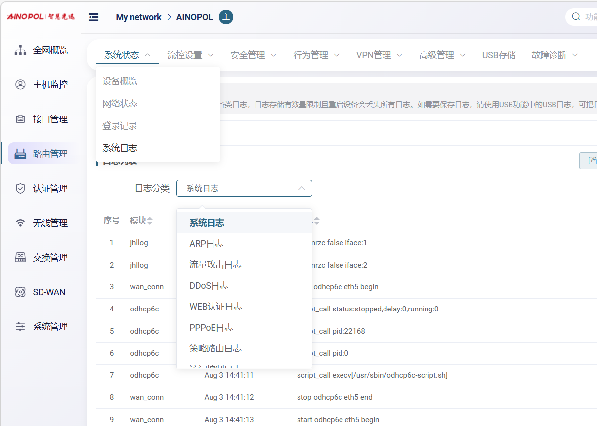 [产品教程】2026.03.27 融合路由-状态管理-系统状态-系统日志 操作背景:当需要查询系统相关日志信息的时候,我们可以点击系统日志进行查询,情况如下: