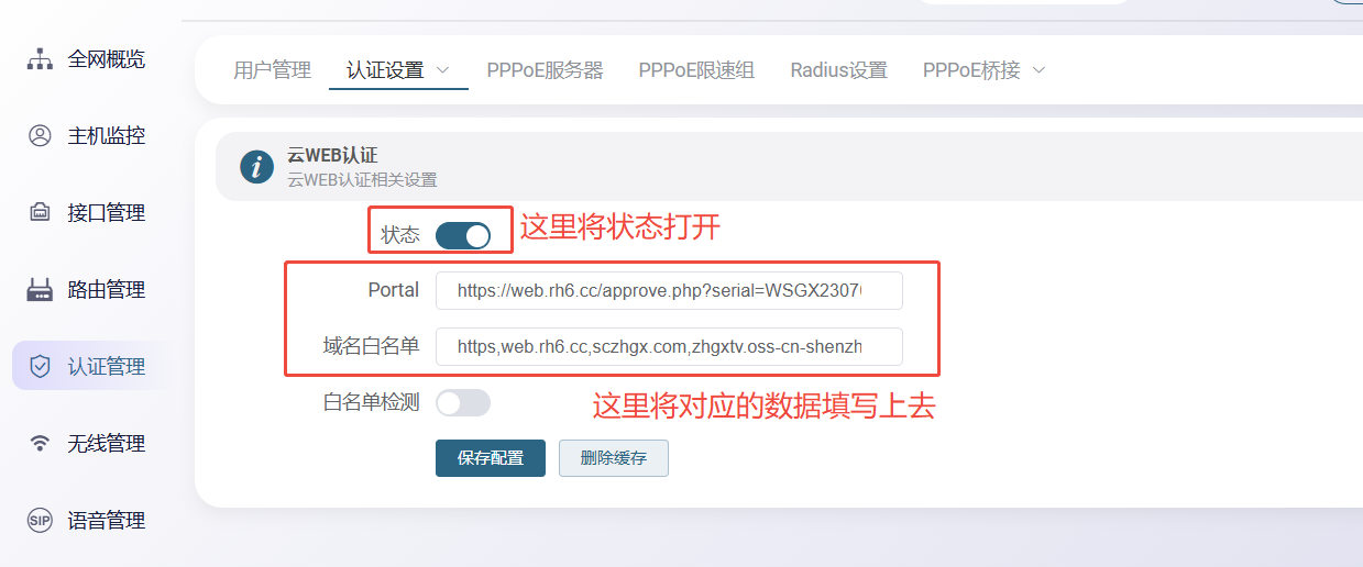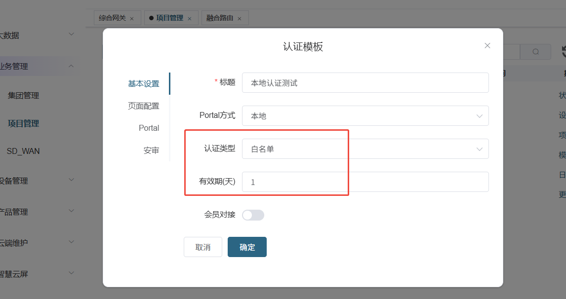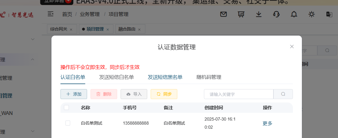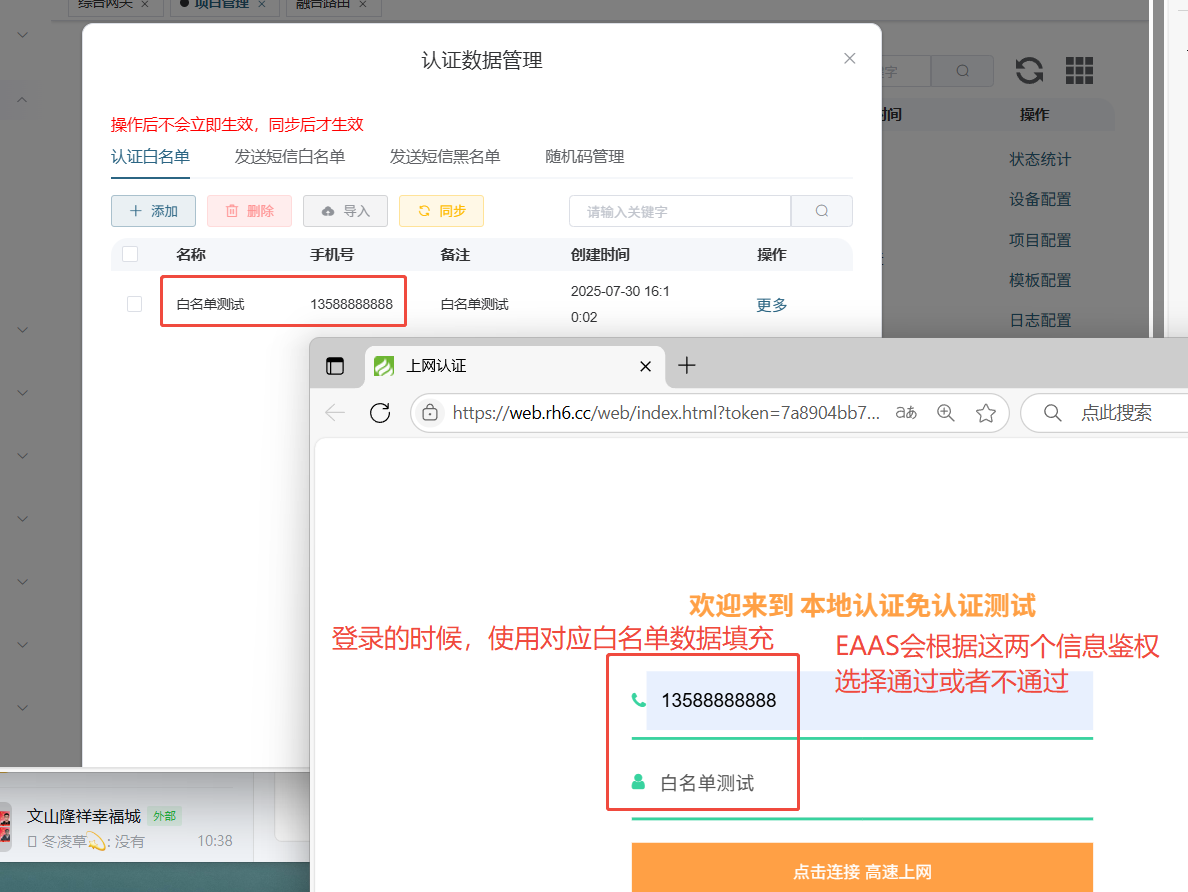 【产品教程】2026.03.27融合路由potal认证-白名单身份认证 操作背景:客户这边需要做potal认证,满足有且仅有后台预设置的手机号码才可以正常放行上网,其他的手机由于没有在后台登记,不允许上网的场景。常用于企业单位,工厂园区,对外来人员上网信息需要标识;特殊外来人员报备后,外来人员可以通过自己的手机号码上网的场景。 (1)鉴权通过条件:用户的手机号码需要在预登记白名单内 (2)使用场景:常用于企业单位,工厂园区,对外来人员上网信息需要标识;特殊外来人员报备后,可以通过自己的手机号码鉴权上网 在EAAS上找到对应的项目,选择模板配置-认证模板  这里potal认证方式为本地认证类型为白名单  配置认证白名单  添加认证数据白名单,白名单中的鉴权信息有:名称和手机号码  添加完成后,如下图所示:  融合路由开启potal开关,进入该项目的路由设备列表中  在EAAS的路由列表里面找到路由,选择更多-认证,将路由的认证配置按钮打开注意:这里没有按照上面的第一步创建认证模板的话,这里的认证按钮是打不开的   开启之后,再次点击更多,认证进去,可以看到有地址出现了这里的Potal网址实际上就是potal服务器的地址  融合路由开启potal认证,设置potal认证针对的网段接口(这里选择van100实际项目上可根据项目的实际情况做配置选择)配置完成后,别忘了点击保存配置后生效  在云web认证中,配置相关的放行域名和potal服务器的地址, 抄写Protal地址:云端有显示 抄写域名白名单:固定填写https,web.rh6.cc,sczhgx.com,zhgxtv.oss-cn-shenzhen.aliyuncs.com  致此,就配置完成了 效果演示 当对应认证电脑接入后,会弹出认证登录页,此时需要输入认证白名单中配置的手机号码方可登录(1)输入正确的名称和手机号码-鉴权通过,弹出认证成功页 (1)输入错误的名称和正确的手机号码-鉴权通过,弹出认证成功页 (2)输入正确的名称或者错误手机号码-鉴权错误,在认证登录页提示账号不存在的提示,无法认证成功