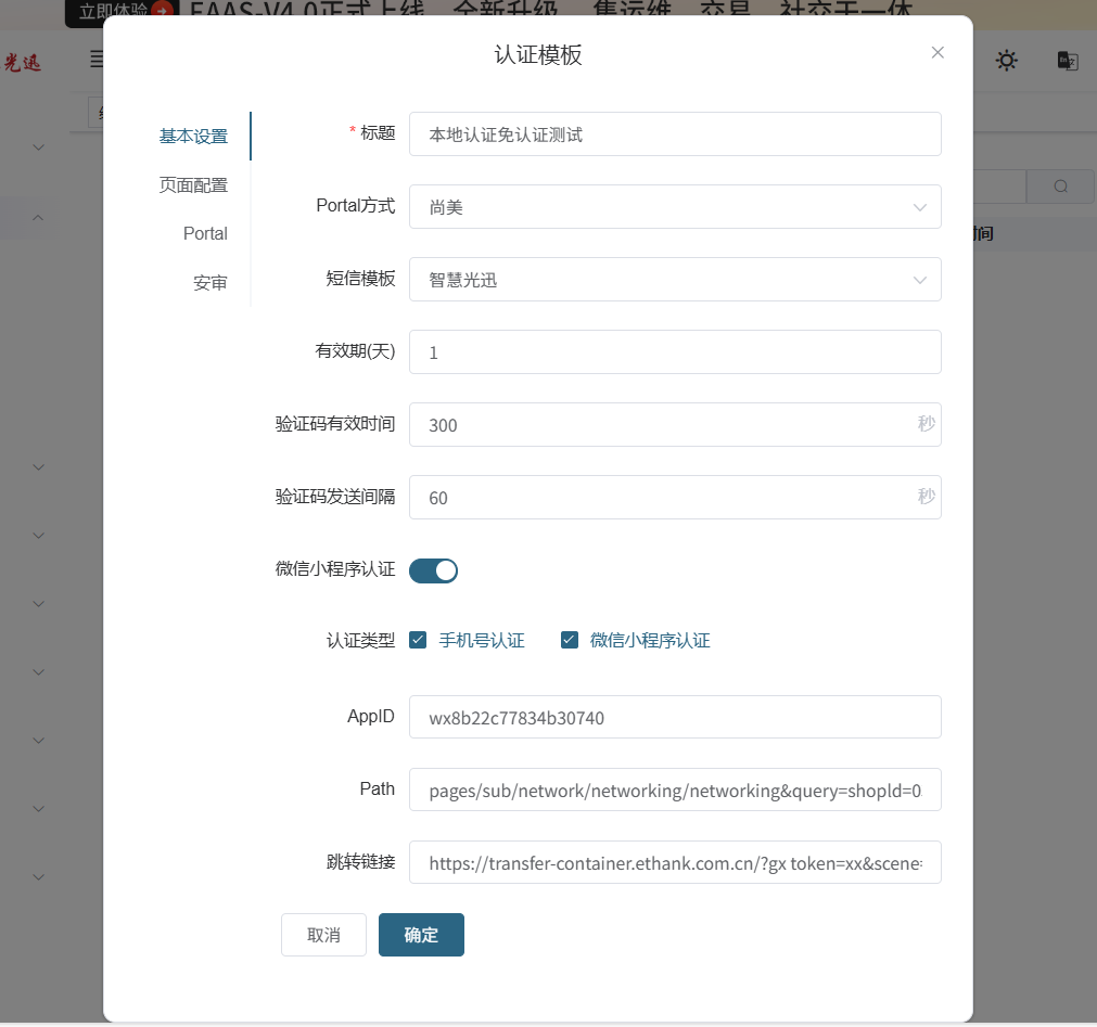 【产品教程】2026.03.27融合路由potal认证-三层漫游跨域认证 操作背景:这是一个集团酒店的场景(比如全季酒店)现客户需要实现在第一家全季酒店认证上网后,在第二家全季酒店不需要再次重新认证上网,两家全季酒店的内网网络相互独立的场景, 该认证模式下也有自己的认证类型,比如:小程序认证,手机验证码认证 (1)鉴权通过条件:根据具体选择的认证类型进行鉴权(手机验证码认证的方式则需要输入对应的手机和对应正确的验证码) (2)使用场景:集团酒店,两家酒店跨酒店网络作业时不需要重新认证(两家酒店虽然网络独立,但是是在同一个认证域内) 在EAAS上找到对应的项目,选择模板配置-认证模板  这里potal认证方式为本地认证类型为尚美认证 注意:尚美这里微信小程序的时候,会有需要填写AppID、Path、跳转链接,这三个参数在任何项目上是一样的,为固定值 AppID: wx8b22c77834b30740 Path: pages/sub/network/networking/networking&query=shopld=03956&scene=1000&gx token=xx 跳连接: https:/transfer-container.ethank.com.cn/?gx token=xx&scene=1001&shopld=03956  融合路由开启potal开关,进入该项目的路由设备列表中  在EAAS的路由列表里面找到路由,选择更多-认证,将路由的认证配置按钮打开注意:这里没有按照上面的第一步创建认证模板的话,这里的认证按钮是打不开的   开启之后,再次点击更多,认证进去,可以看到有地址出现了这里的Potal网址实际上就是potal服务器的地址  融合路由开启potal认证,设置potal认证针对的网段接口(这里选择van100实际项目上可根据项目的实际情况做配置选择)配置完成后,别忘了点击保存配置后生效  在云web认证中,配置相关的放行域名和potal服务器的地址, 抄写Protal地址:云端有显示 抄写域名白名单:固定填写https,web.rh6.cc,sczhgx.com,zhgxtv.oss-cn-shenzhen.aliyuncs.com  致此,就配置完成了 效果演示 (1)微信扫码认证模式  (2)手机号认证模式