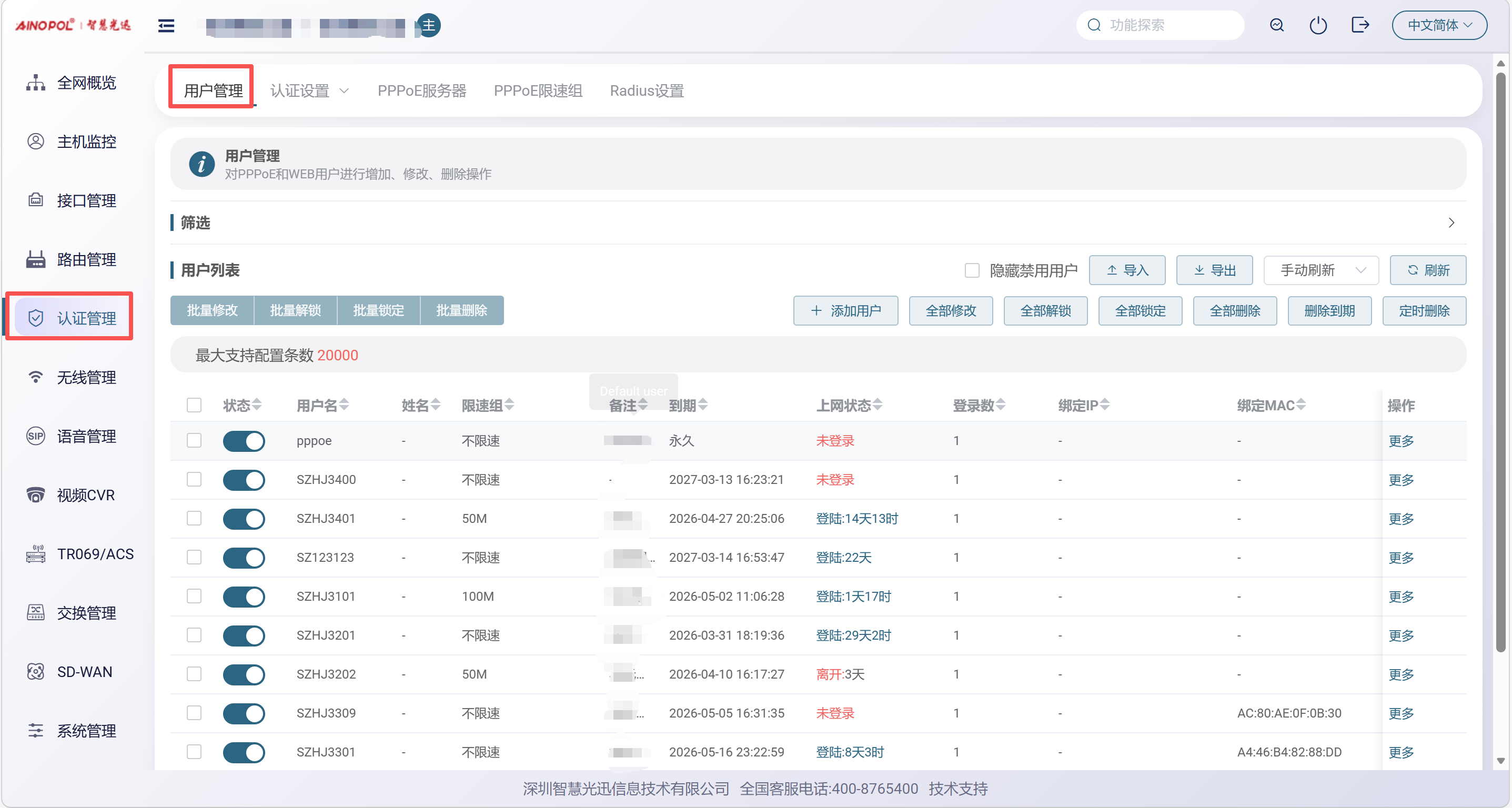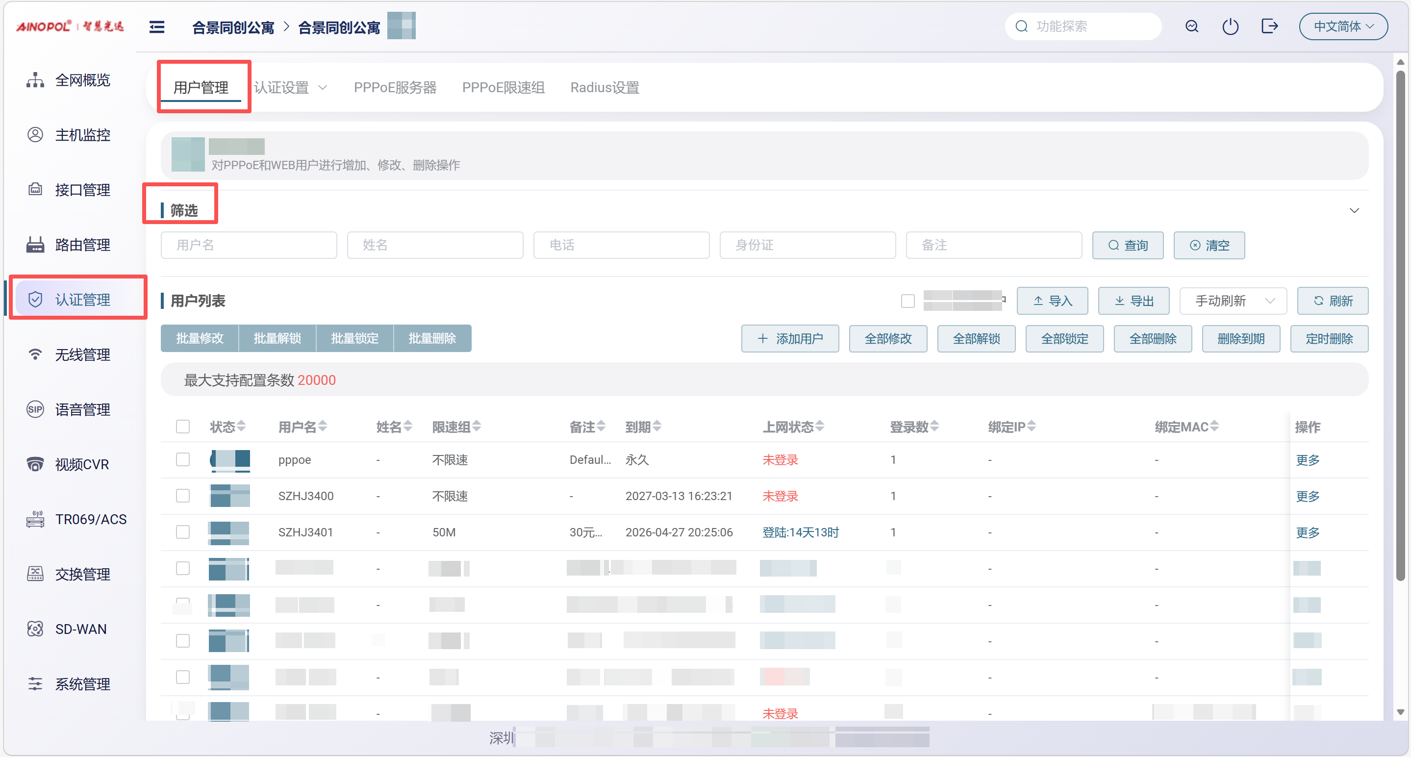 【产品教程】2026.03.27融合路由-PPPOE SERVER-用户管理 PPPoE 拨号上来的用户都会显示在这里,同时也可以查看用户的详细信息。  在这里还可以进行以下操作: 1. 创建新用户 2. 批量修改用户账号信息 3. 对用户进行锁定(禁止上网)或解锁 4. 批量删除用户,或一键删除所有用户 5. 删除已到期的用户账号 6. 定时删除用户 7. 批量导入 PPPoE 账号和密码 点击“筛选”后,可以根据账号信息精确定位到所需查找的账号。