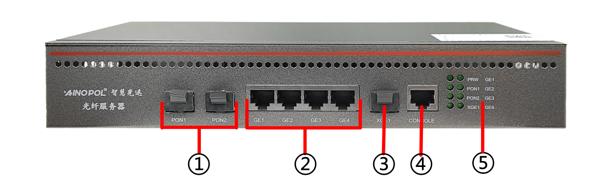 机架式OLT硬件说明 设备型号:ZH-2GS 设备参数:13寸桌面式双口GPON光纤服务器 交换容量:16Gbps 包转发率:23.808Mpps 2个GPON用户端口(含C+模块) 1\*10GE光口+4\*GE网口上行端口 1个console口 最大支持256个ONU接入 功耗:≤15W 外置电源:DC 12V 1.5A 产品尺寸:270\*160\*44mm 产品重量:1.15kg 工作温度:-10℃~75℃ 产品外观及硬件规格说明:  图1 ZH-2GS产品正面  图2 ZH-2GS产品背面 1、接口说明  ①:PON口:GPON协议,插入PON模块后,链接SC光纤至分光器进行无缘分光 ②:网口:四个千兆RJ45接口 ③:光口:一个万兆SFP+光口 ④:CONSOLE接口:是一种典型的配置接口,用于服务器后台命令行管理。通过使用Console线直接连接至计算机的串口。 ⑤:指示灯:显示系统状态及接口状态指示灯  ⑥:接地 ⑦:电源接口 DC 12V 1.5A