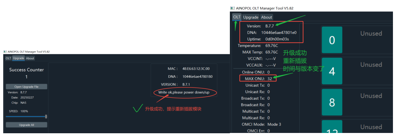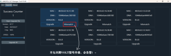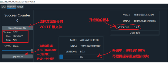 假设目前我接A服务器82599万兆组装网卡装的爱快/融合路由等系统 自适应千兆不成功,则我需要准备以下环境 **升级环境说明:** 1:笔记本、网线 (笔记本或台式机必须要win10~win11的系统 ,**win7无法使用**) 2:VOLT模块 (根据自己的型号升级对应的版本) 3:交换机带光口,或带光口的服务器 (**这里指的是能够让模块正常UP使用的设备**) 注意:只允许VOLT同型号升级,即 16-up-16,32-up-32 的方式 1:电脑必须具备安装“Wireshark” 软件,如果没有则先安装 这个抓包工具软件 工具:“Wireshark-win64-4.0.0” 压缩包附件有提供 2:打开软件“Ainopol UPG **V5.82**” 笔记本有线,接交换机网线口 需保持和VOLT模块在同一个VLAN上 ,能实现网络互通 (选择本地网卡,链接交换机的网卡,然后右下角运行起来,保持**Running**状态)  3:如果需要升级,选择对应的文件进行升级 VOLT-16-千兆 ( 版本7.7 )20250227-VOLT16-B7.7-1000M.bin VOLT-32-千兆 ( 版本7.7 )20250227-VOLT32-B7.7-1000M.bin VOLT-32-2.5G ( 版本7.7 )20250227-VOLT32-B7.7-2500M.bin **注意:2.5G只有光口设备“支持强制2.5G速率”才可以UP起来,注意注意!!**  4:提示升级成功后,需要插拔一下模块, 然后重新看运行时间与版本变化 (升级过程中,请勿电脑高负载运行网卡松动,升级过程等待,不要关闭软件)  备注:如果同时升级多个VOLT模块的时候,可以通过切换不同的VOLT观察当前VOLT版本 (当一个环境下,有多个VOLT模块,可以通过左下方可以选择不同的VOLT模块检查状态) 注意:只允许VOLT同型号升级,即 16-up-16,32-up-32 的方式