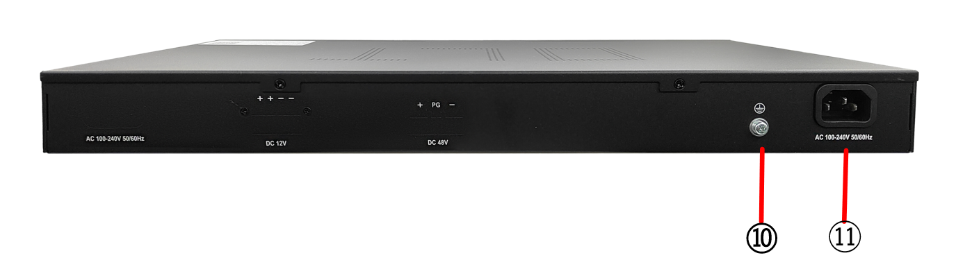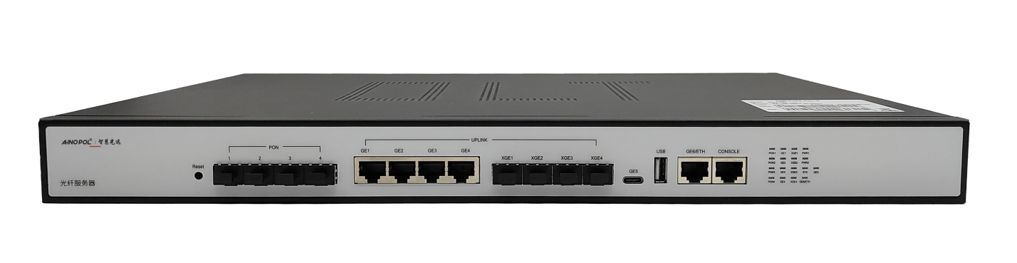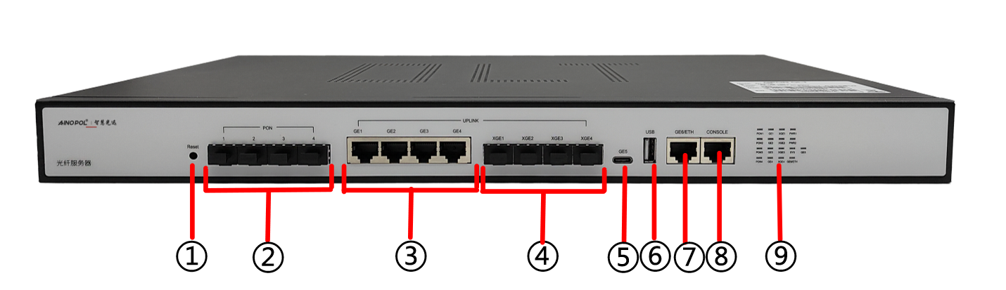 机架式OLT硬件说明 设备型号:ZH-4GS(Ultra) 设备参数:19寸1U机架式GPON光纤服务器 交换容量:336Gbps 包转发率:108Mpps 4*GPON用户端口 4*10GE光口上行 4*GE网口上行 1*Type-c 1*USB口 最大支持512个ONU接入 功耗:≤50W 内置电源:100-240V AC 50/60Hz 产品尺寸:440\*262\*44mm 产品重量:3.25kg 工作温度:-10℃~55℃ 产品外观及硬件规格说明:  图1 ZH-4GS(Ultra)产品正面  图2 ZH-4GS(Ultra)产品背面 1、接口说明  ①:Reset键:复位建,长按恢复出厂。 ②:PON口:GPON协议,插入PON模块后,链接SC光纤至分光器进行无缘分光 ③:网络接口:四个千兆RJ45接口 ④:网络接口:四个万兆SFP+光口 ⑤:Type-c接口 ⑥:USB接口 ⑦:ETH口:带外管理口,默认管理地址192.168.100.1 ⑧:CONSOLE接口:是一种典型的配置接口,用于服务器后台命令行管理。通过使用Console线直接连接至计算机的串口。 ⑨:指示灯:显示系统状态及接口状态指示灯  ⑩:接地 ⑪:电源接口:100-240V AC50/60Hz