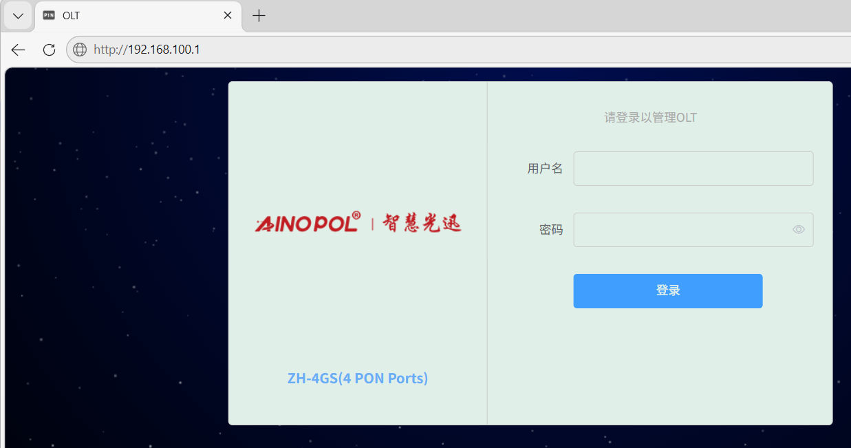 【产品教程】-基础 2026.04.01 盒式GPON 设备登录-设备的访问 操作背景:成功连接OLT就,咱们就可以通过web访问到OLT了,具体操作和介绍如下: 首先打开浏览器(目前支持 firefox/chrome/IE 9 以及更高级版本) 其次输入 OLT 的管理 IP 地址 ①192.168.100.1(带外管理地址,接 NMS 口) ②10.8.8.6(带内管理地址,接上联口) 如下图所示,输入用户名和密码登录:  说明: 1、 默认的用户名和密码是 root/Zhgxnet@123,跟登录命令行是相同的; 2、同一用户可以同时登录网页和命令行; 3、 页面超时退出是 5 分钟,如果在 5 分钟内没有任何操作,页面会自动退出;