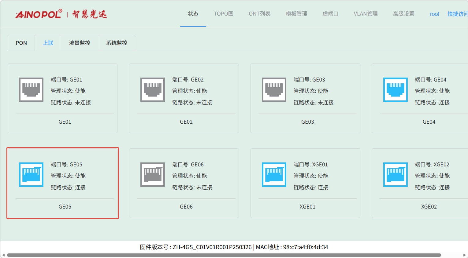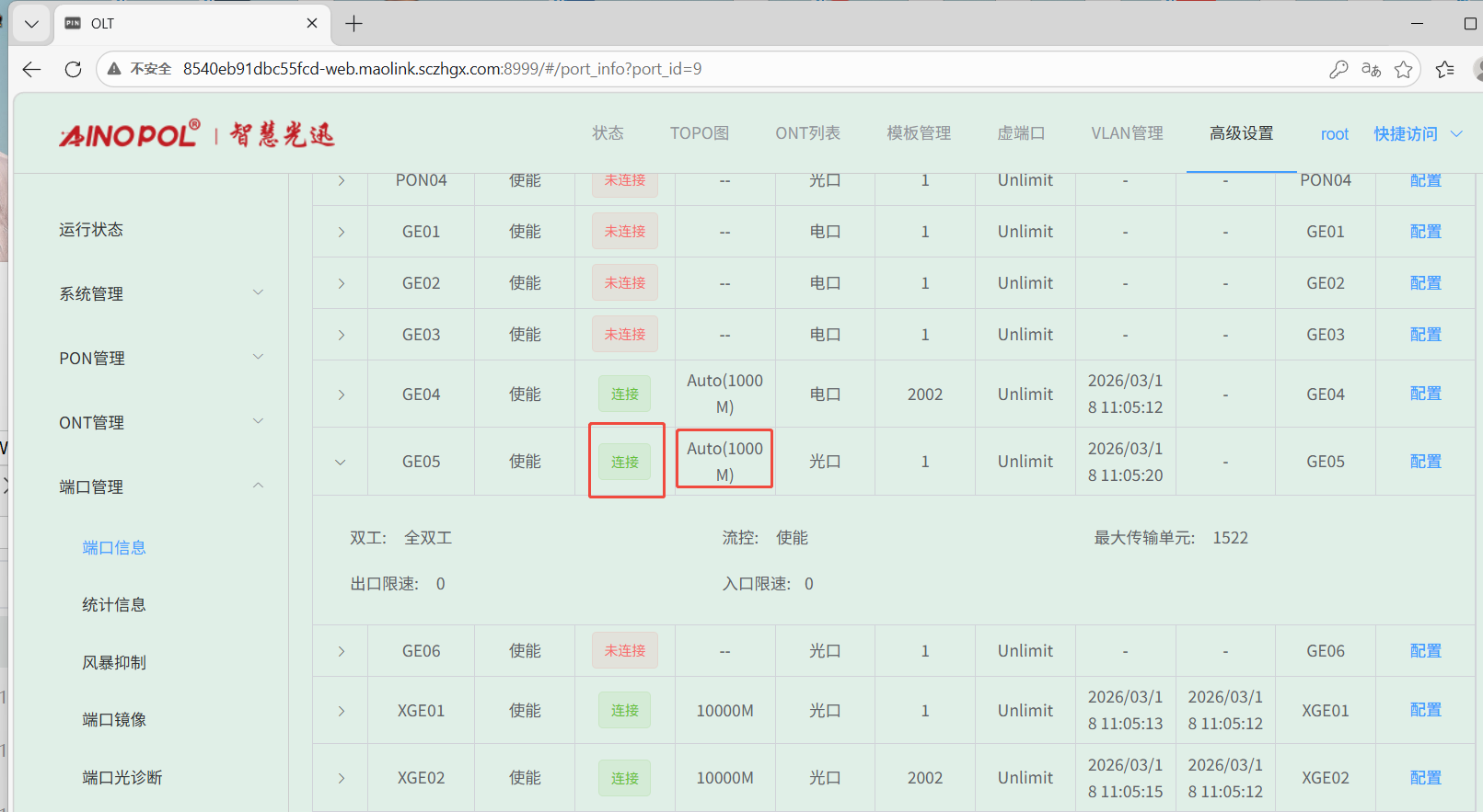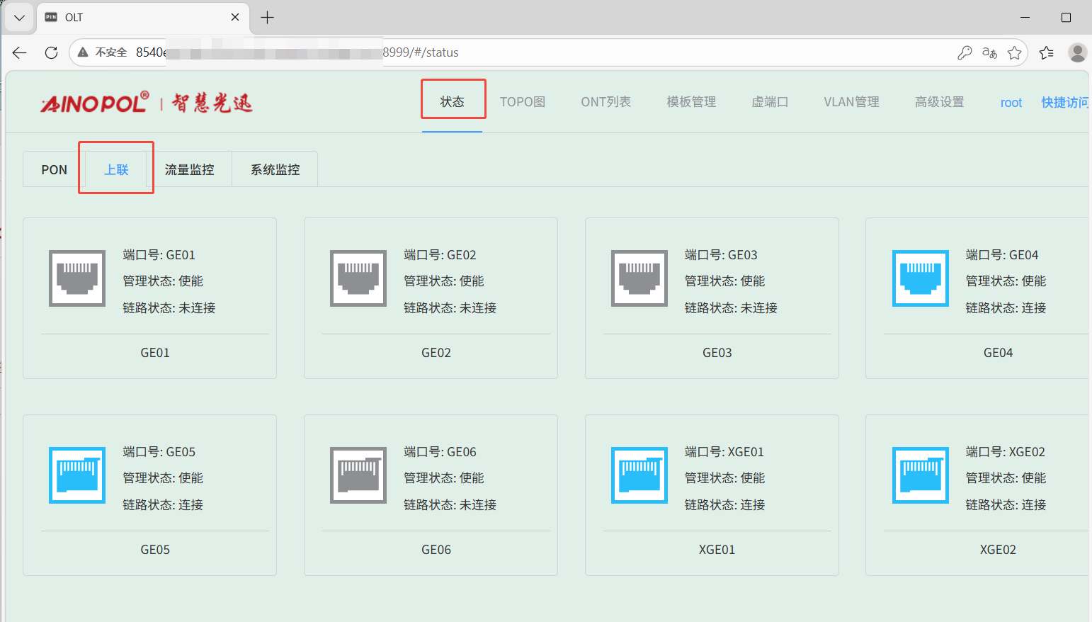【产品教程】-基础 2026.04.01 盒式GPON 状态查询-上联端口状态查询 操作背景:我们还可以查看到OLT的上联口接线情况和端口协商状态速率情况,具体情况如下 登录 WEB 后,选择状态 -> 上联,在该页面可查看到各个上联口状态信息。将展示 端口管理状态以及链路连接状态。灰色表示未连接状态,蓝色表示连接状态。  鼠标单击任意 一端口号图标,可快捷访问高级设置 -> 端口管理 -> 端口配置去进行端口参数配置。如下 图所示:  点击进去后,查看到具体的端口情况如下图所示: