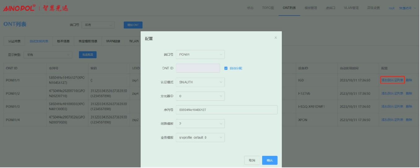自动发现管理-批量添加 ONT 到认证列表(仅支持 SN 注册模式)