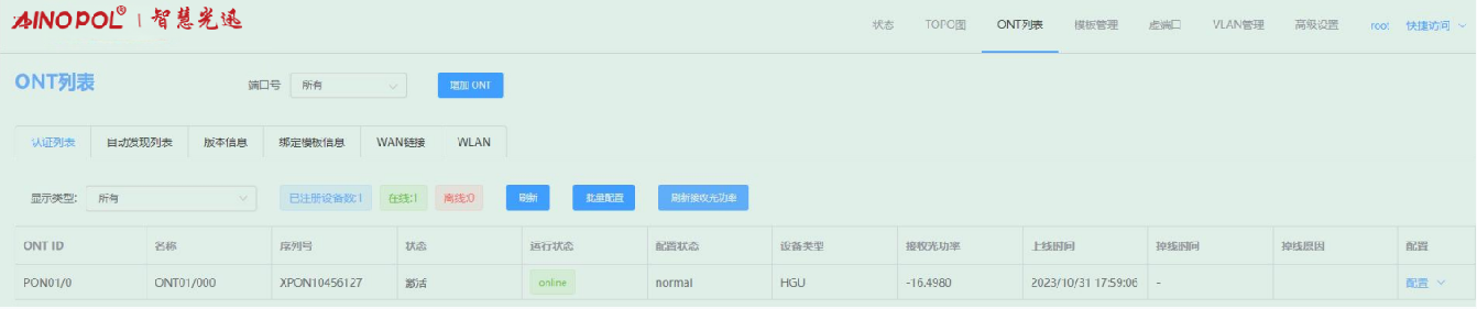 【产品教程】-基础 2026.04.01 盒式GPON 自动发现管理-添加ONT到认证列表 点击“添加到认证列表”,在弹出的配置框输入 ONT 各项信息即可添加 ONT 注册上线。如下图所示:  添加完成后,在认证列表中可以查看到添加进来的ONT信息