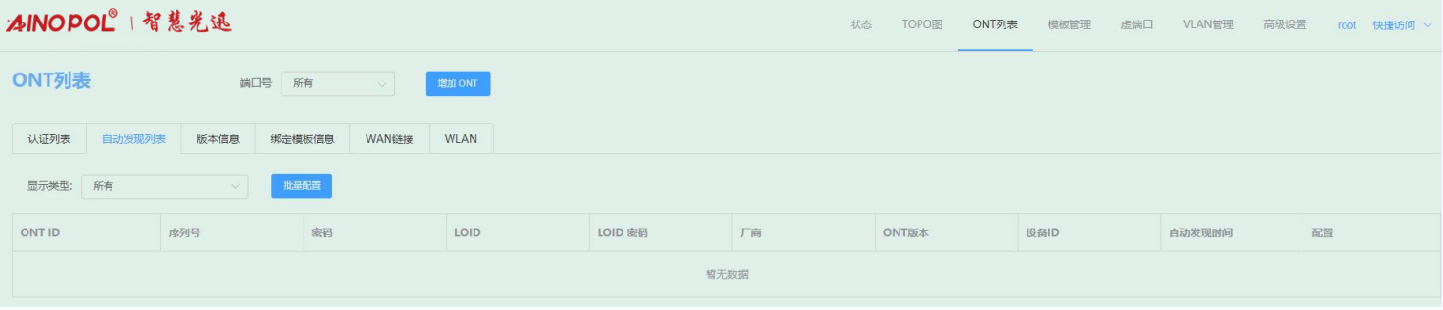 【产品教程】-基础 2026.04.01 盒式GPON 自动发现管理-从自动发现列表批量删除 ONT 在自动发现列表页面,点击“批量配置”,再勾选对应要删除的 ONT,接着点击“删除”后在弹出的确认框点击“确认”即可批量删除自动发现的 ONT。如下图所示:  删除后,可以在列表中看到,自动发现的ONT已经成功批量删除