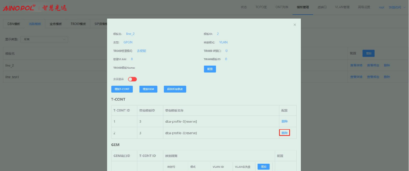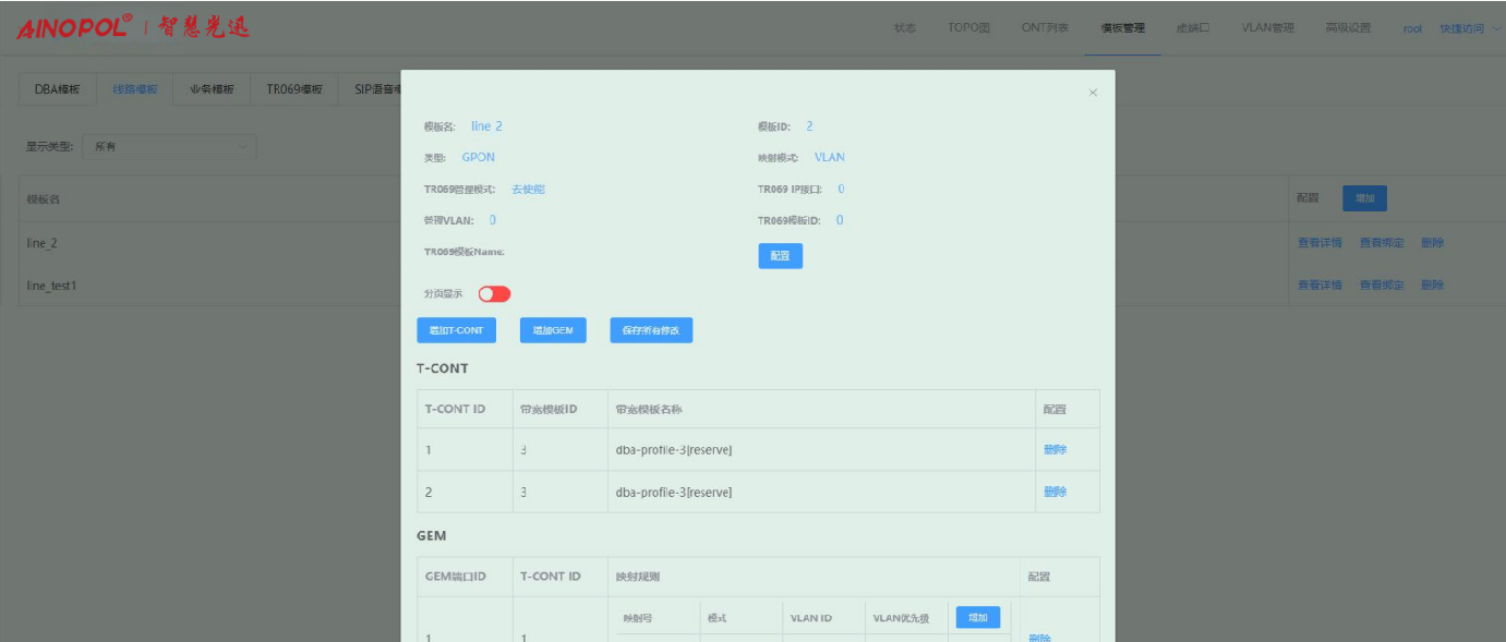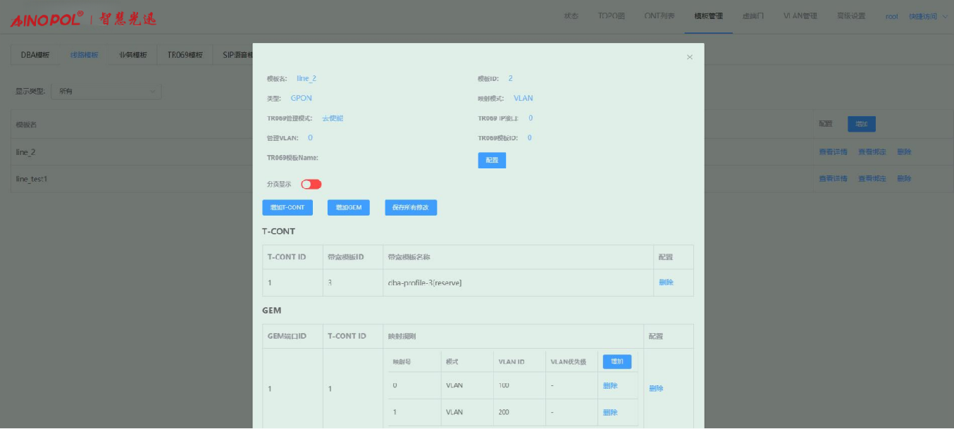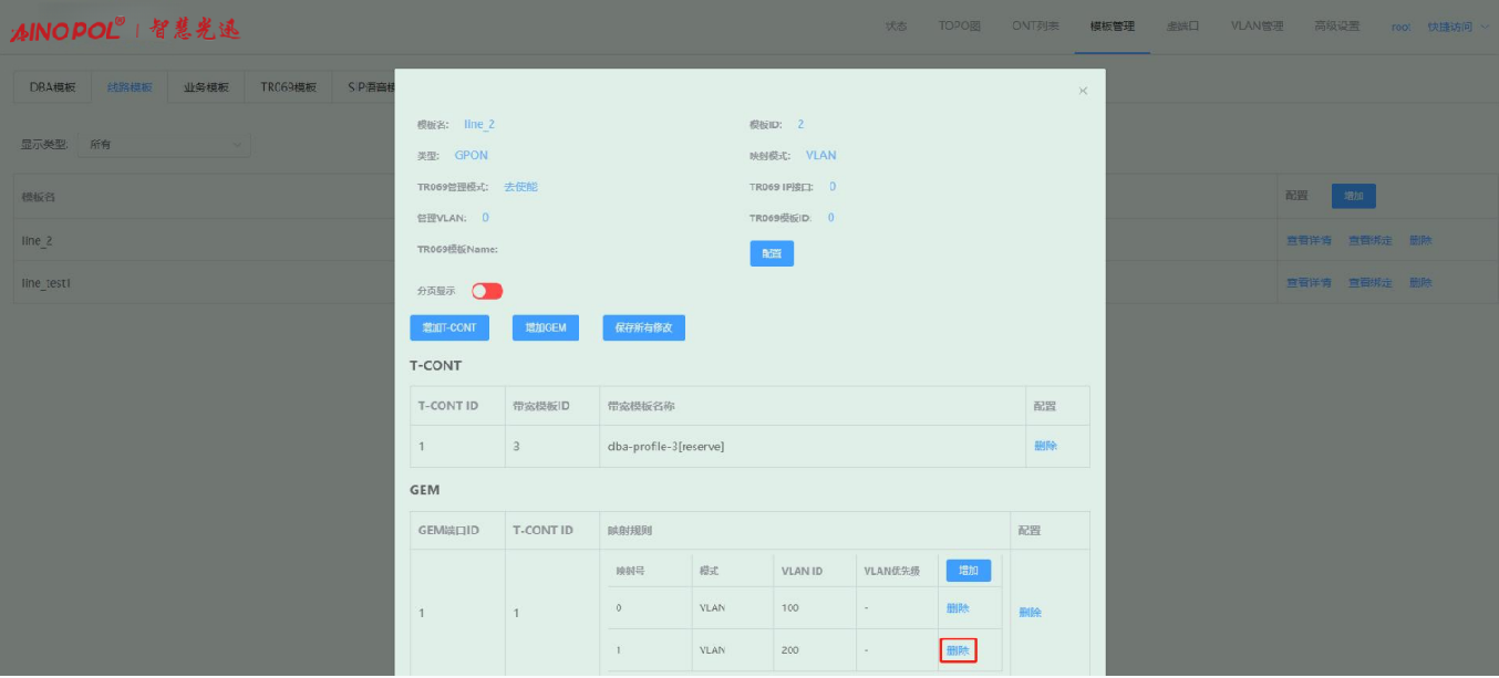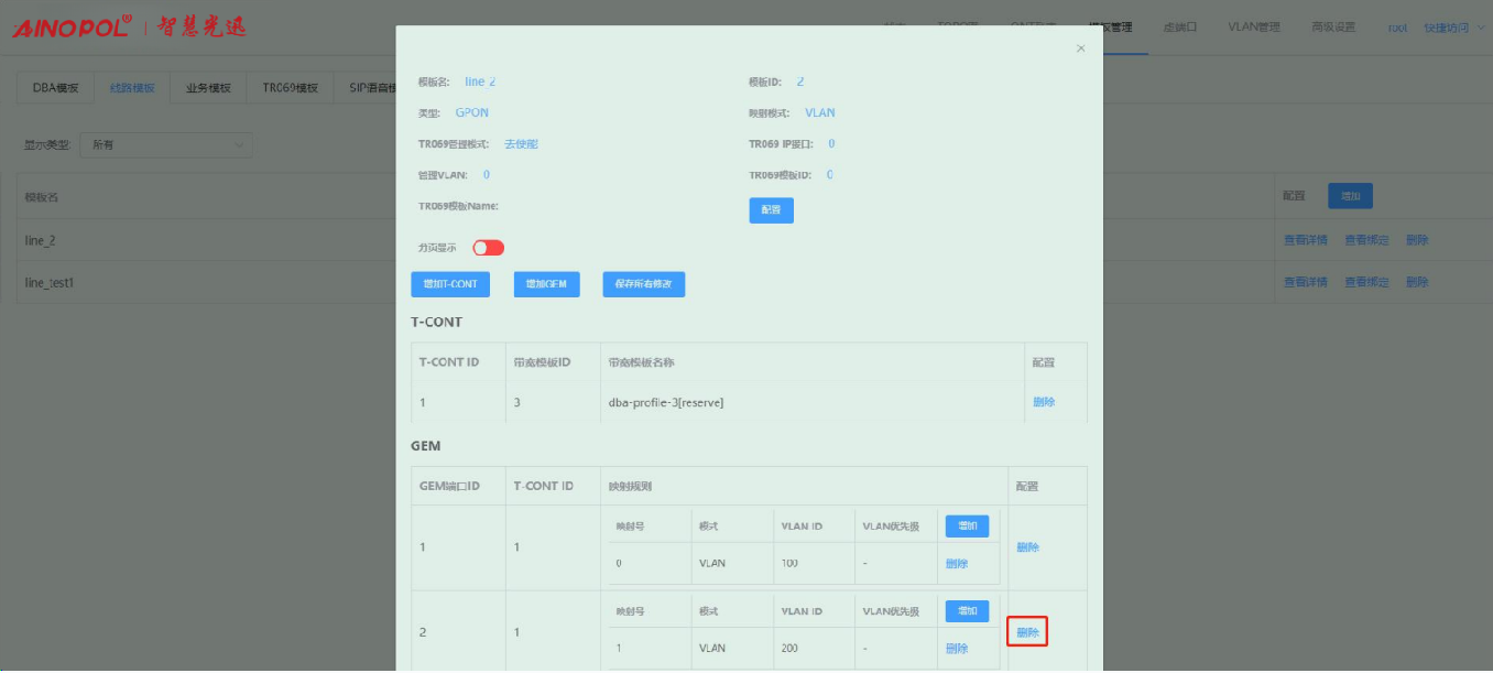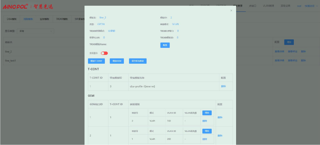【产品教程】-基础 2026.04.01 盒式GPON 模板管理-线路模板-修改线路模板配置 进入线路模板页面,点击线路模板右侧“查看详情”按钮,在弹出的框内修改对应的参数。如下图所示:  1、点击“配置”按钮,在弹出的框内可修改对应的参数。如下图所示:  2、点击“增加 T-CONT”按钮,在弹出的框内可新增 T-CONT。如下图所示:   3、点击对应 T-CONT 条目右侧“删除”按钮,可删除对应 T-CONT。如下图所示  4、点击“增加 GEM”按钮,在弹出的框内可新增 GEM。如下图所示:    5、点击 GEM 条目右侧“删除”按钮,可删除对应 GEM 端口。如下图所示  6、增加映射规则:点击映射规则“增加”按钮,在弹出的框内可新增一条映射规则。如下图所示:   注:Untag 仅允许一条映射规则。 7、删除映射规则:点击映射规则“删除”按钮,在弹出的框内可删除对应的映射规则。如下图所示:  8、修改配置之后,会出现“保存所有配置”按钮,点击即可保存做出的修改。如下图所示: