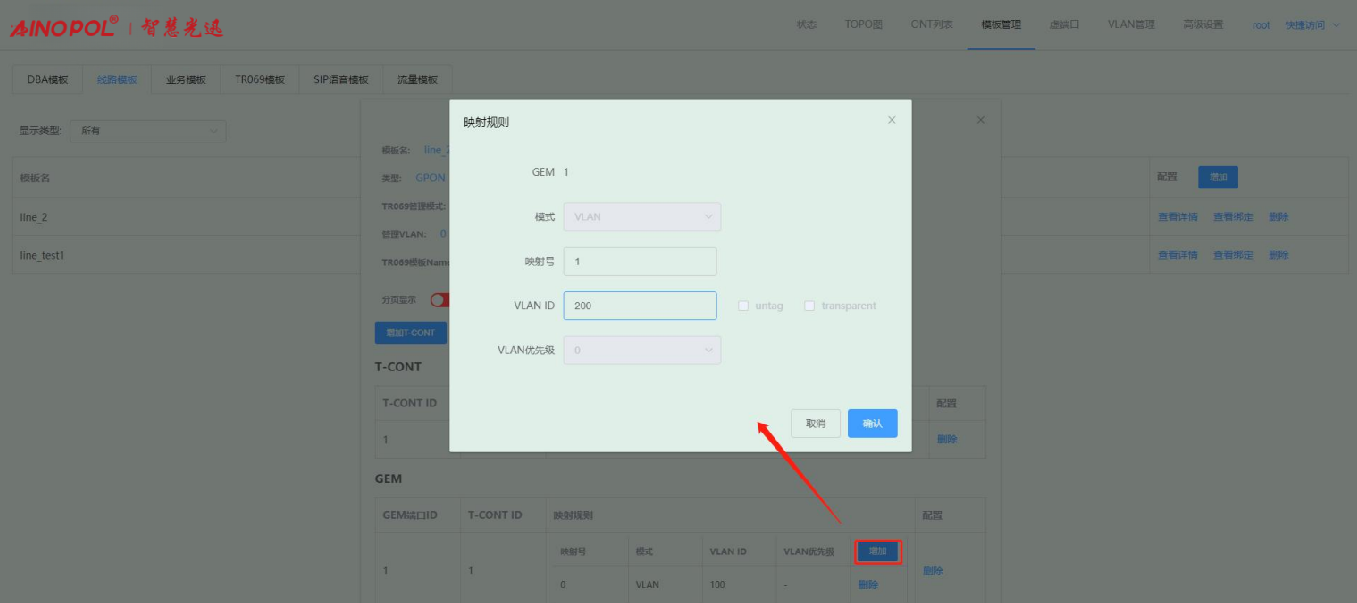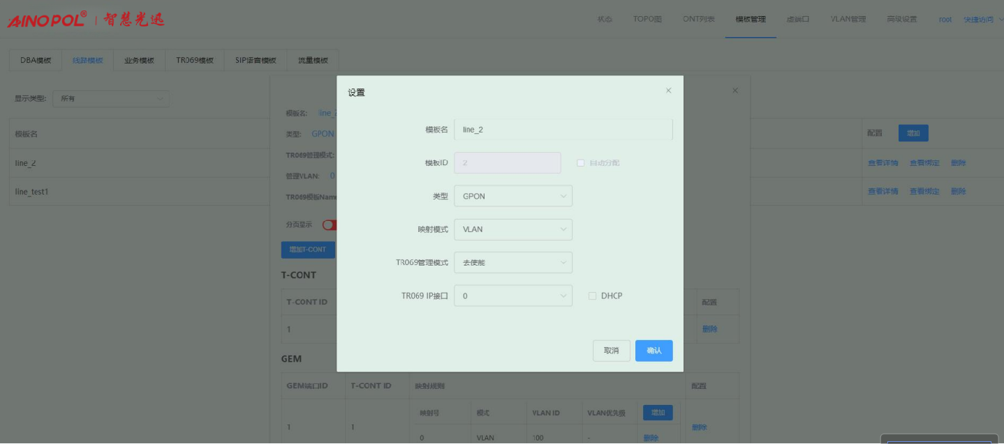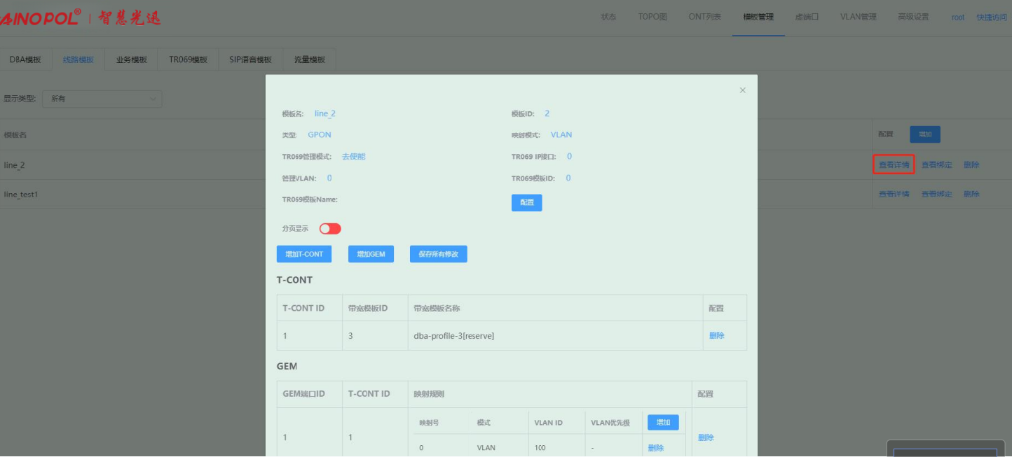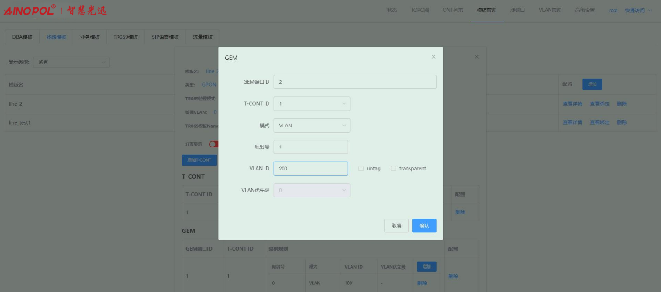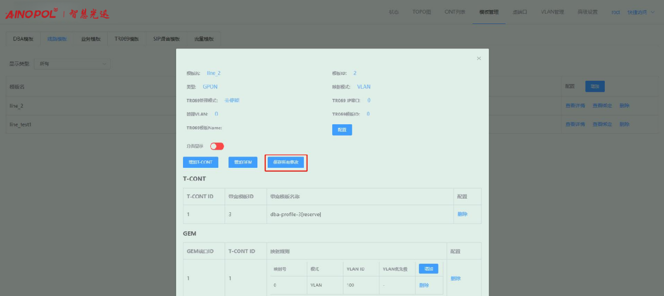 【产品教程】-基础 2026.04.01 盒式GPON 模板管理-线路模板-修改线路模板配置 进入线路模板页面,点击线路模板右侧“查看详情”按钮,在弹出的框内修改对应的参数。如下图所示:  1、点击“配置”按钮,在弹出的框内可修改对应的参数。如下图所示:  2、点击“增加 T-CONT”按钮,在弹出的框内可新增 T-CONT。如下图所示:   3、点击对应 T-CONT 条目右侧“删除”按钮,可删除对应 T-CONT。如下图所示  4、点击“增加 GEM”按钮,在弹出的框内可新增 GEM。如下图所示:    5、点击 GEM 条目右侧“删除”按钮,可删除对应 GEM 端口。如下图所示  6、增加映射规则:点击映射规则“增加”按钮,在弹出的框内可新增一条映射规则。如下图所示:   注:Untag 仅允许一条映射规则。 7、删除映射规则:点击映射规则“删除”按钮,在弹出的框内可删除对应的映射规则。如下图所示:  8、修改配置之后,会出现“保存所有配置”按钮,点击即可保存做出的修改。如下图所示:
