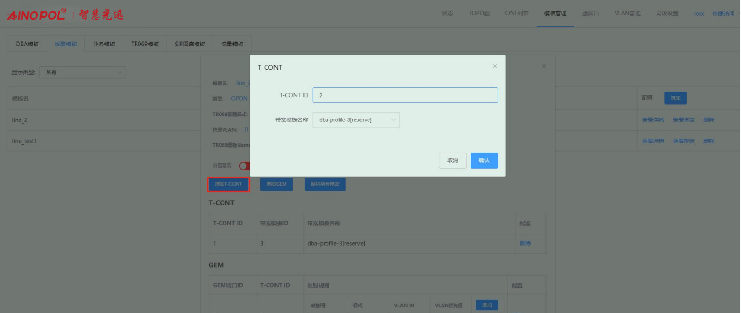 模板管理-线路模板-配置 T-CONT 绑定 DBA 模板