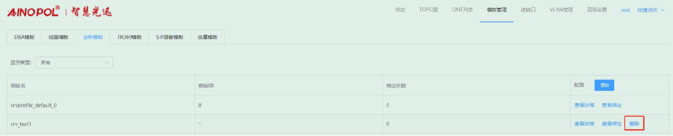 【产品教程】-基础 2026.04.01 盒式GPON 模板管理-业务模板-删除业务模板 进入业务模板页面,找到需要删除的业务模板,点击“删除”按钮,在弹出的框内确认即可。如下图所示:  注:系统缺省的业务模板 0 只能修改配置,不能删除,另外已经绑定 ONT 的业务模板也不能删除,必须解除绑定之后才可以删除