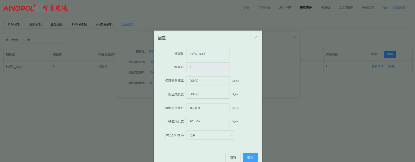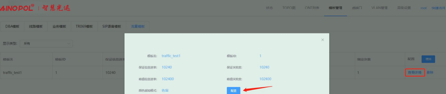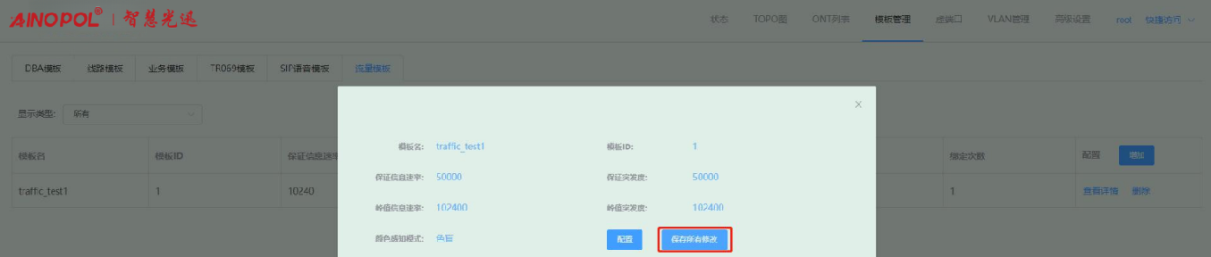 【产品教程】-基础 2026.04.01 盒式GPON 模板管理-流量模板-修改流量模板 进入流量模板页面,选择要修改的流量模板,点击“查看详情”按钮,在弹出的框内修改对应的参数。如下图所示:   修改配置之后,会出现“保存所有配置”按钮,点击即可修改保存做出的修改。如下图所示: