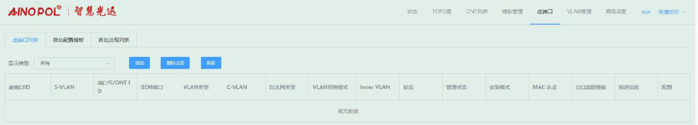 【产品教程】-基础 2026.04.01 盒式GPON 虚接口-查看终端虚接口 虚端口用于用户设备的接入,通过用户设备接到虚端口形成业务流,从而使用户接入各种业务流。成功执行后,业务承载于此虚端口上。 选择虚端口 -> 虚端口列表,在该页面可增加、删除、修改和查看各业务虚端口。如下图所示: