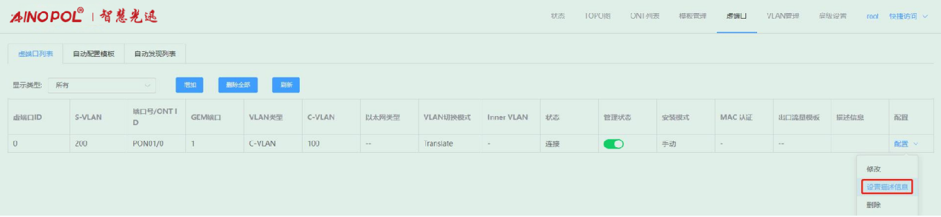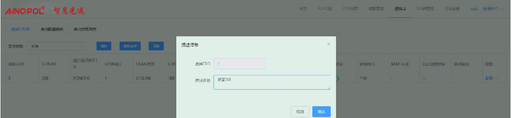 【产品教程】-基础 2026.04.01 盒式GPON 虚接口-配置虚端口描述信息 鼠标光标移至虚端口条目右侧“配置”按钮,点击“设置描述信息”在弹出的框内输入要设置的描述信息。如下图所示: 找到需要修改的业务虚端口,点击右边编辑设置描述信息  编辑设置描述信息  编辑点击确定后,可见已添加了描述信息