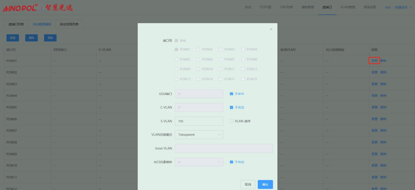 【产品教程】-基础 2026.04.01 盒式GPON 虚接口-自动配置模板-修改自动配置模板 点击自动配置模板条目右侧“配置”,在弹出的框内可修改 S-VLAN 和 VLAN 切换模式。如下图所示: