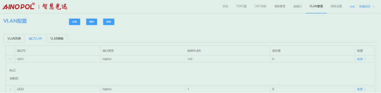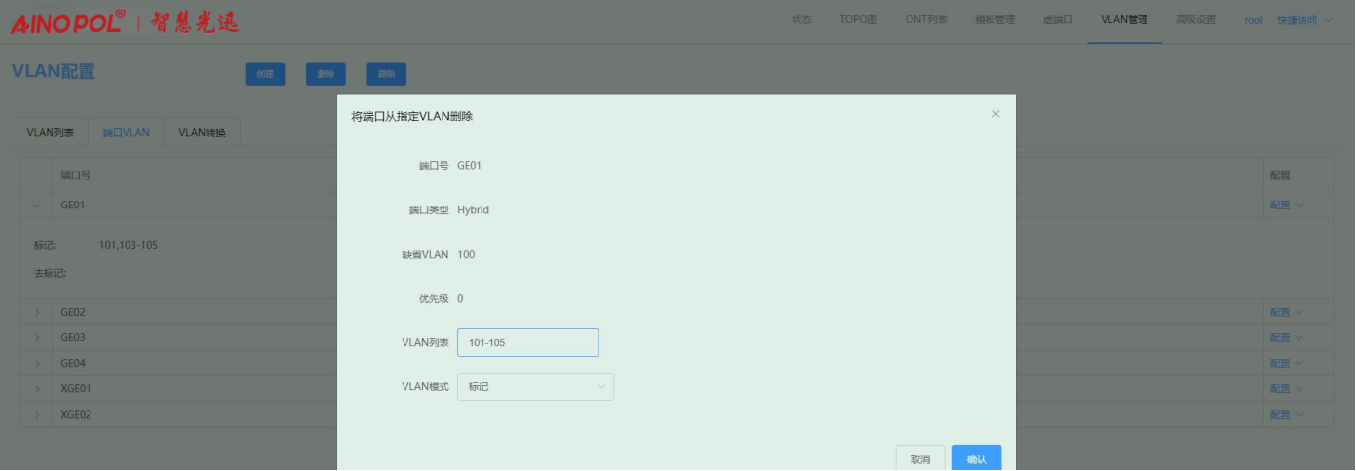 【产品教程】-基础 2026.04.01 盒式GPON 端口VLAN-从 VLAN 删除指定端口 点击“将端口从指定 VLAN 删除”,可以给该端口删除 VLAN。如下图所示: