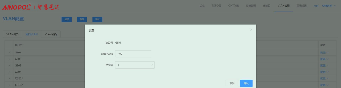 【产品教程】-基础 2026.04.01 盒式GPON 端口VLAN-配置端口缺省 VLAN 点击“缺省 VLAN”,可以修改端口缺省 VLAN 和优先级,系统默认每个端口缺省VLAN为1。如下图所示: