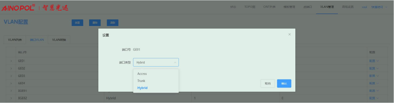 【产品教程】-基础 2026.04.01 盒式GPON 端口VLAN-配置端口类型 点击“端口类型”,可以配置端口类型,包括 hybrid、access 和 trunk 三种模式。如下图所示: