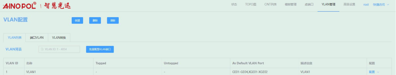 【产品教程】-基础 2026.04.01 盒式GPON VLAN管理-查看VLAN列表 点击“VLAN 管理”,可以查看与配置全局 VLAN、端口 VLAN 和 VLAN 转换。如下图所示: