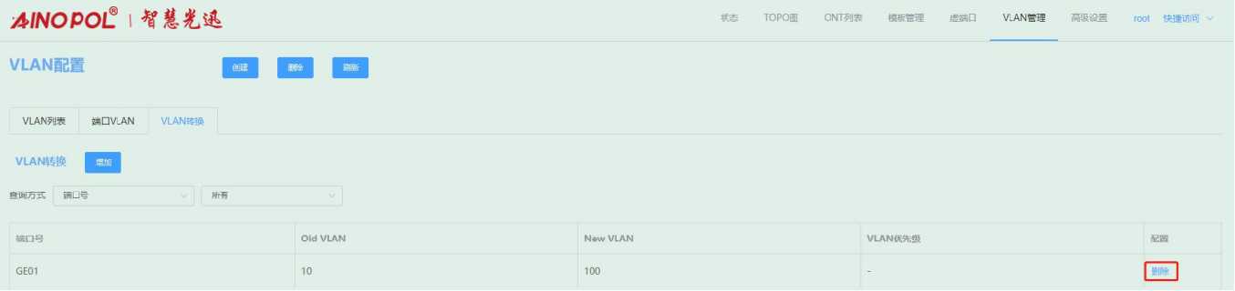 【产品教程】-基础 2026.04.01 盒式GPON VLAN-VLAN转换-删除 VLAN 转换 点击要删除的转换条目右侧的“删除”按钮,可以去除该配置。如下图所示: