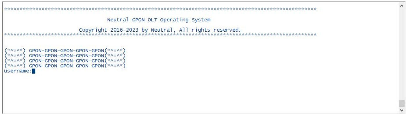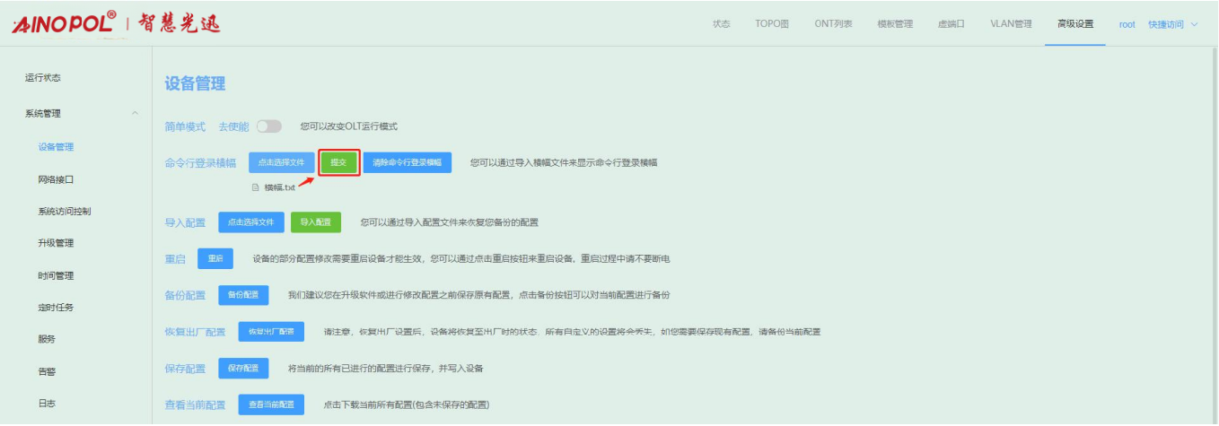【产品教程】-基础 2026.04.01 盒式GPON 系统设置-命令行登录横幅 可以通过导入 txt 文档配置命令行的登录横幅。下图是未配置的默认命令行登录横幅:  1、导入命令行登录横幅 点击“命令行登录横幅”右侧的“点击选择文件”,选择如下图所示的 txt 文档后,点击“提交”。  再次登录命令行其横幅会发生改变。如下图所示:  2、清除命令行登录横幅 点击“清除命令行登录横幅”,将导入的命令行登录横幅清除。