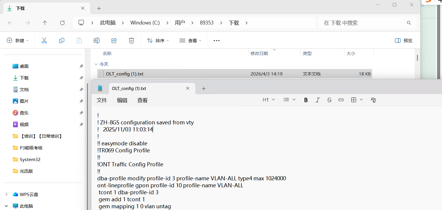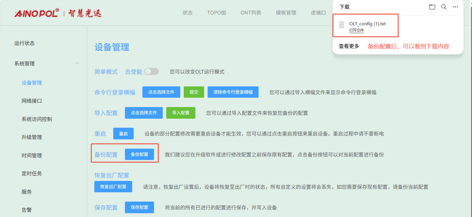 【产品教程】-基础 2026.04.01 盒式GPON 系统设置-设备的备份 点击“备份配置”按钮,会下载一个名为 oltconfig.txt 的备份配置文件。如下图所示:  下载后,咱们可以打开备份文件,查看备份的内容