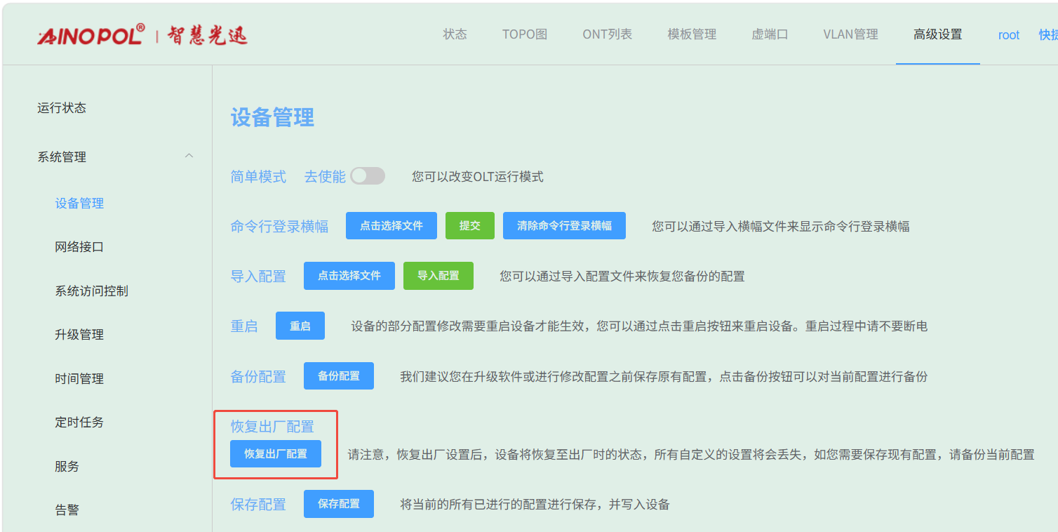 【产品教程】-基础 2026.04.01 盒式GPON 系统设置-设备恢复出产设置 点击“恢复出厂配置”按钮,在弹出的框内点击确认即可将设备恢复默认配置。