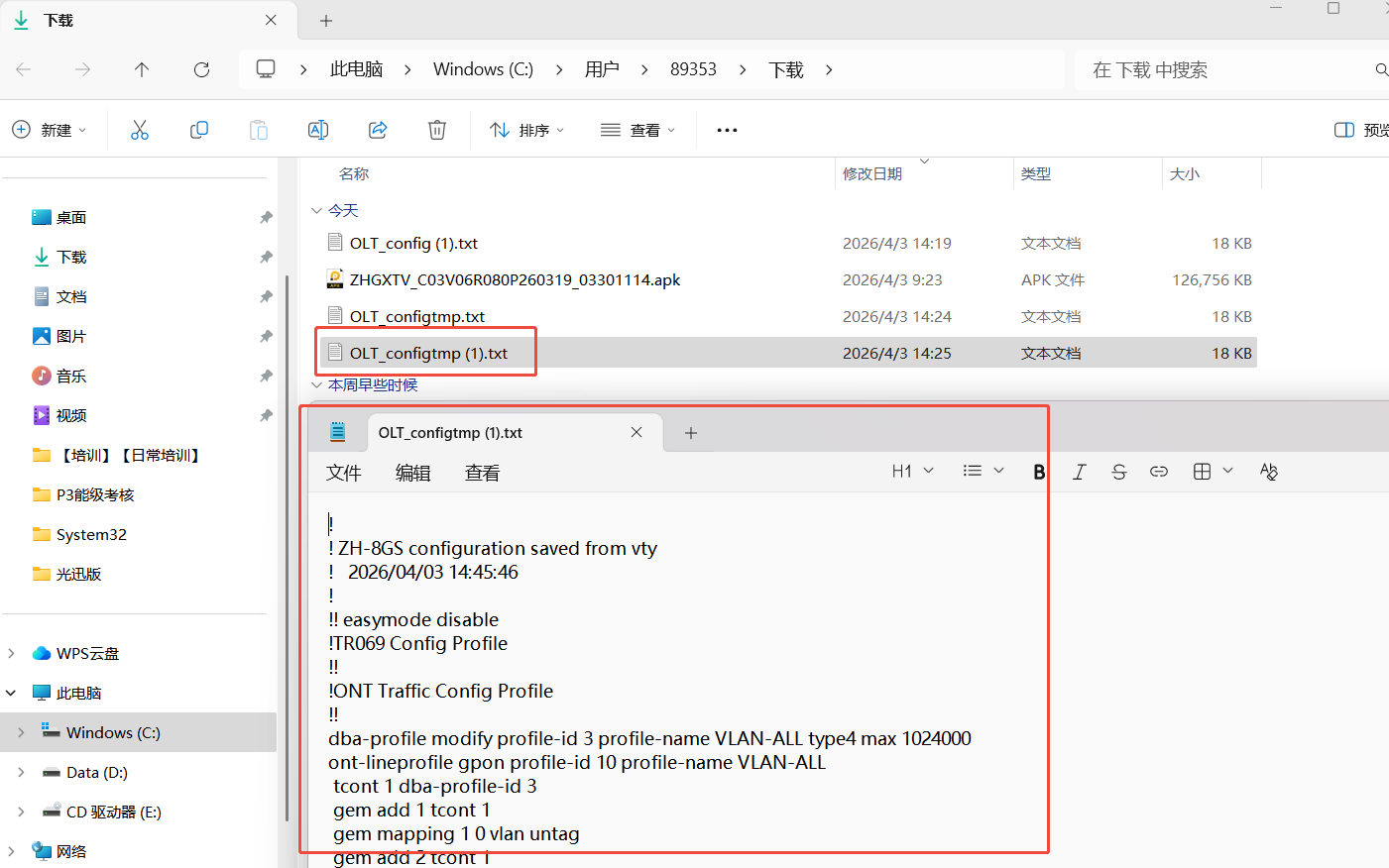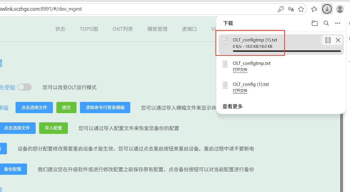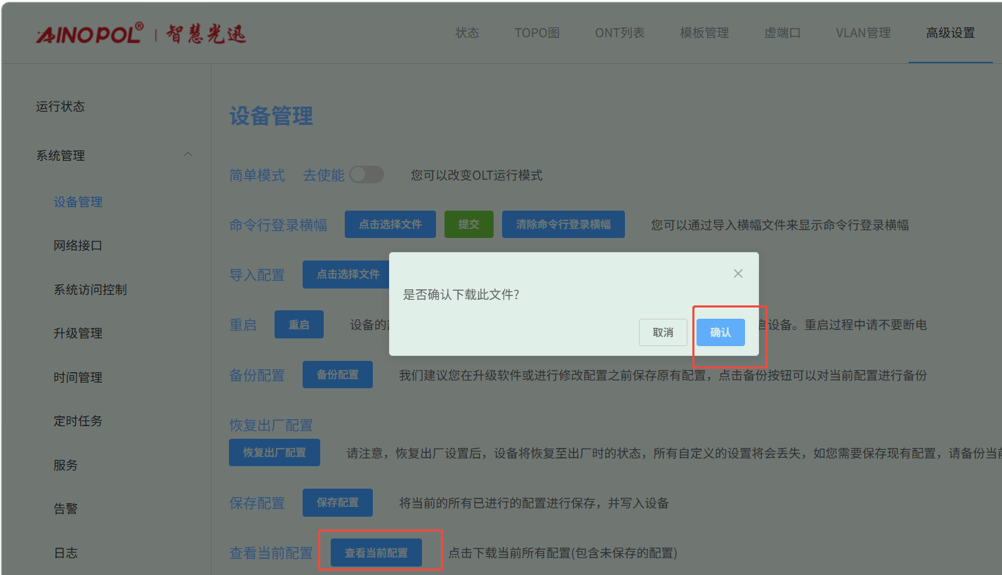 【产品教程】-基础 2026.04.01 盒式GPON 系统设置-查看配置 点击“查看当前配置”按钮,可下载查看配置文件。如下图所示:  点击确定后,即可下载配置  我们可以点击文件打开查看当前配置